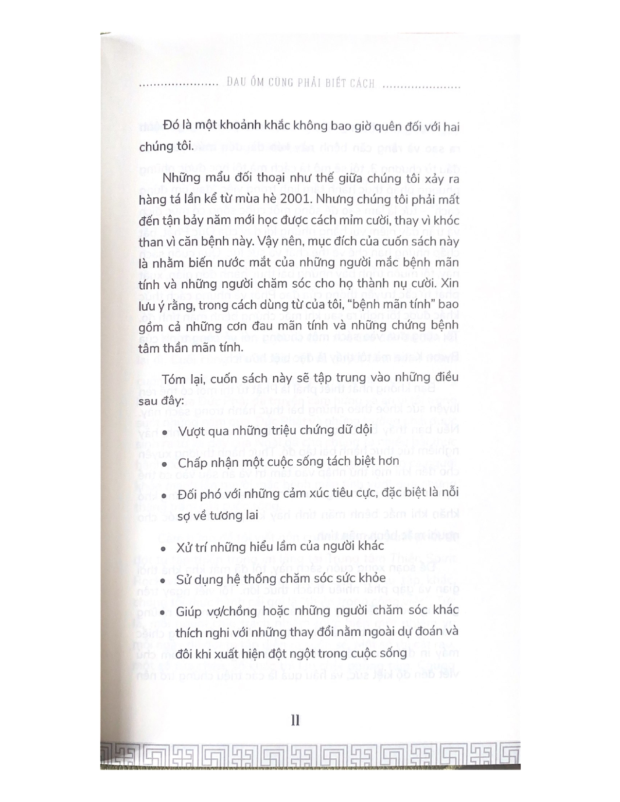 Với kiến thức thông thái về giáo lý nhà Phật và những bài thực hành được Toni đúc kết từ bài giảng của Đức Phật hay của các vị thiền sư nổi tiếng, cũng như từ chính kinh nghiệm sống của cô, đây là quyển cẩm nang cần thiết đối với những ai đang mắc bệnh mãn tính và những ai đang chăm sóc người bệnh mãn tính.
