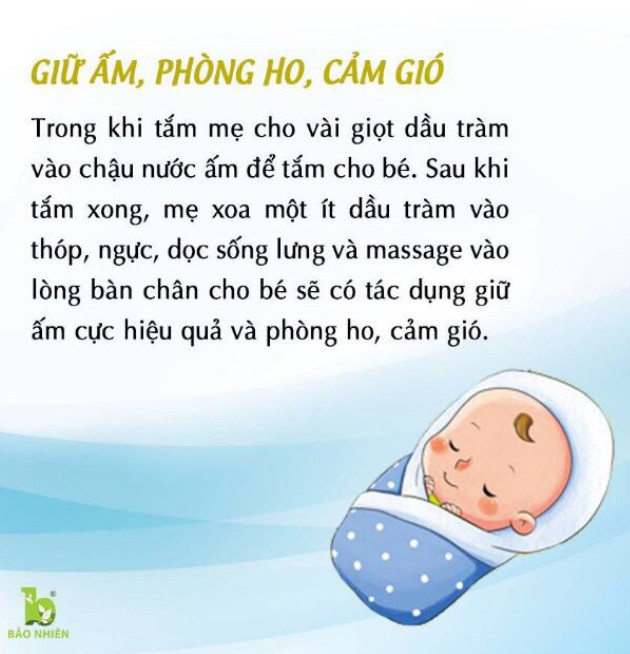 - Hướng dẫn sử dụng sản phẩm Dầu Tràm Bảo Nhiên *Sơ sinh và trẻ nhỏ: Thoa gan bàn chân, bàn tay, ngực và lưng … giúp giữ ấm cơ thể. Pha nước ấm để tắm giúp chống lạnh giữ ấm cơ thể bé. Thoa vào vết cắn côn trùng. **Người bình thường: Xông phòng để giữ cho không khí khô thoáng, trong sạch. Xông, hít, ngửi dầu vào vùng mũi họng để giảm khò khè, nghẹt mũi. Xoa vào chỗ đau, vết căn côn trùng. Xoa vào vùng lưng và chân đau nhức của mẹ bầu và sau sinh.