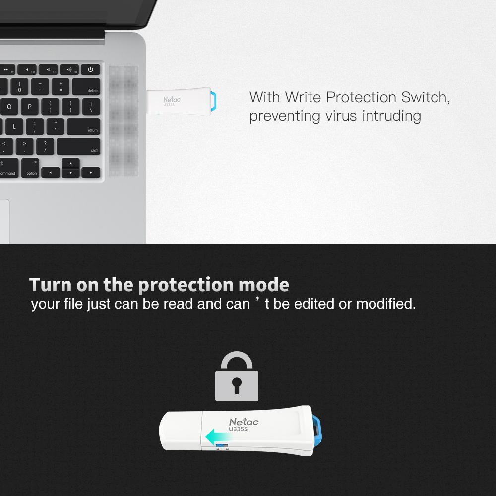 Elevate your memory storage with Netac U335S flash drive. Featuring Write Protection Switch, when you turn on the protection mode, your file can not be tampered and just can be read, which successfully protect your
