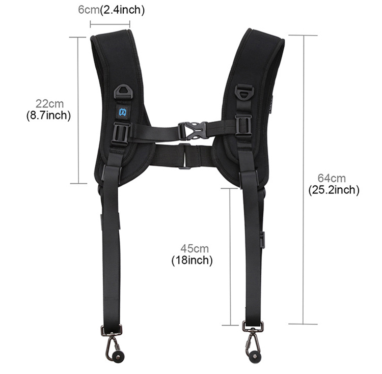 - Có thể điều chỉnh cho mọi kích cỡ: Cho dù bạn cao hay thấp, dây đeo máy ảnh kép của chúng tôi sẽ điều chỉnh để mang lại cảm giác vừa vặn, hoàn hảo, cho phép bạn di chuyển tự do và chụp ảnh mà không gặp rắc rối với độ dài dây đeo không khớp.
