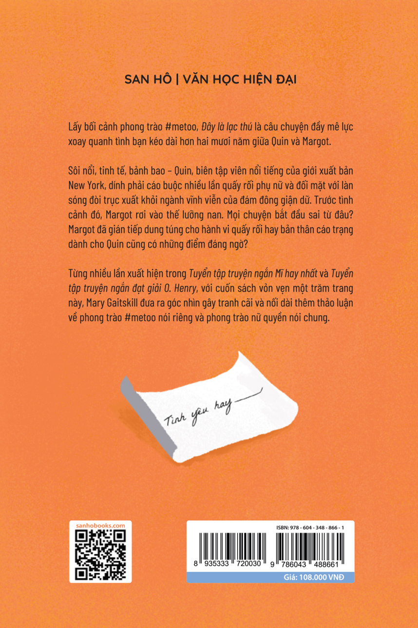 Từng nhiều lần xuất hiện trong Tuyển tập truyện ngắn Mĩ hay nhất và Tuyển tập truyện ngắn đạt giải O. Henry, với cuốn sách vỏn vẹn một trăm trang này, Mary Gaitskill đưa ra góc nhìn gây tranh cãi và nối dài thêm thảo luận về phong trào #metoo nói riêng và phong trào nữ quyền nói chung.