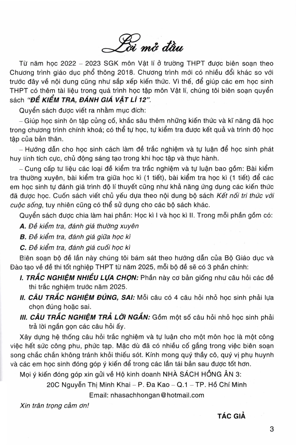 Từ năm học 2022 – 2023 SGK môn Vật lí ở trường THPT được biên soạn theo Chương trình giáo dục phổ thông 2018. Chương trình mới có nhiều đổi khác so với trước đây về nội dung cũng như sắp xếp kiến thức. Vì thế, để giúp các em học sinh THPT có thêm tài liệu trong quá trình học tập môn Vật lí, chúng tôi biên soạn quyển sách “ĐỀ KIỂM TRA, ĐÁNH GIÁ VẬT LÍ 12”.