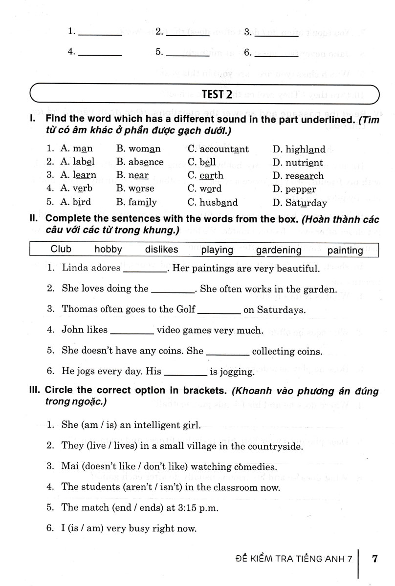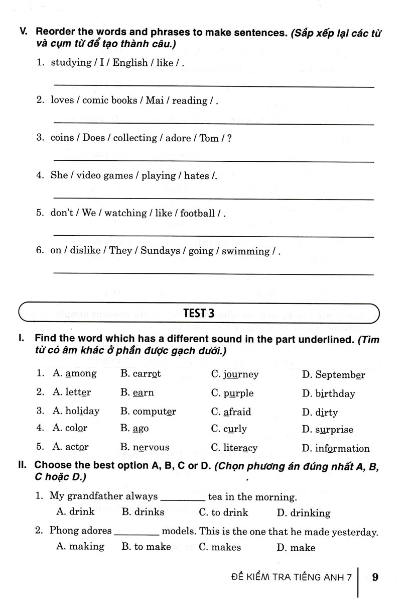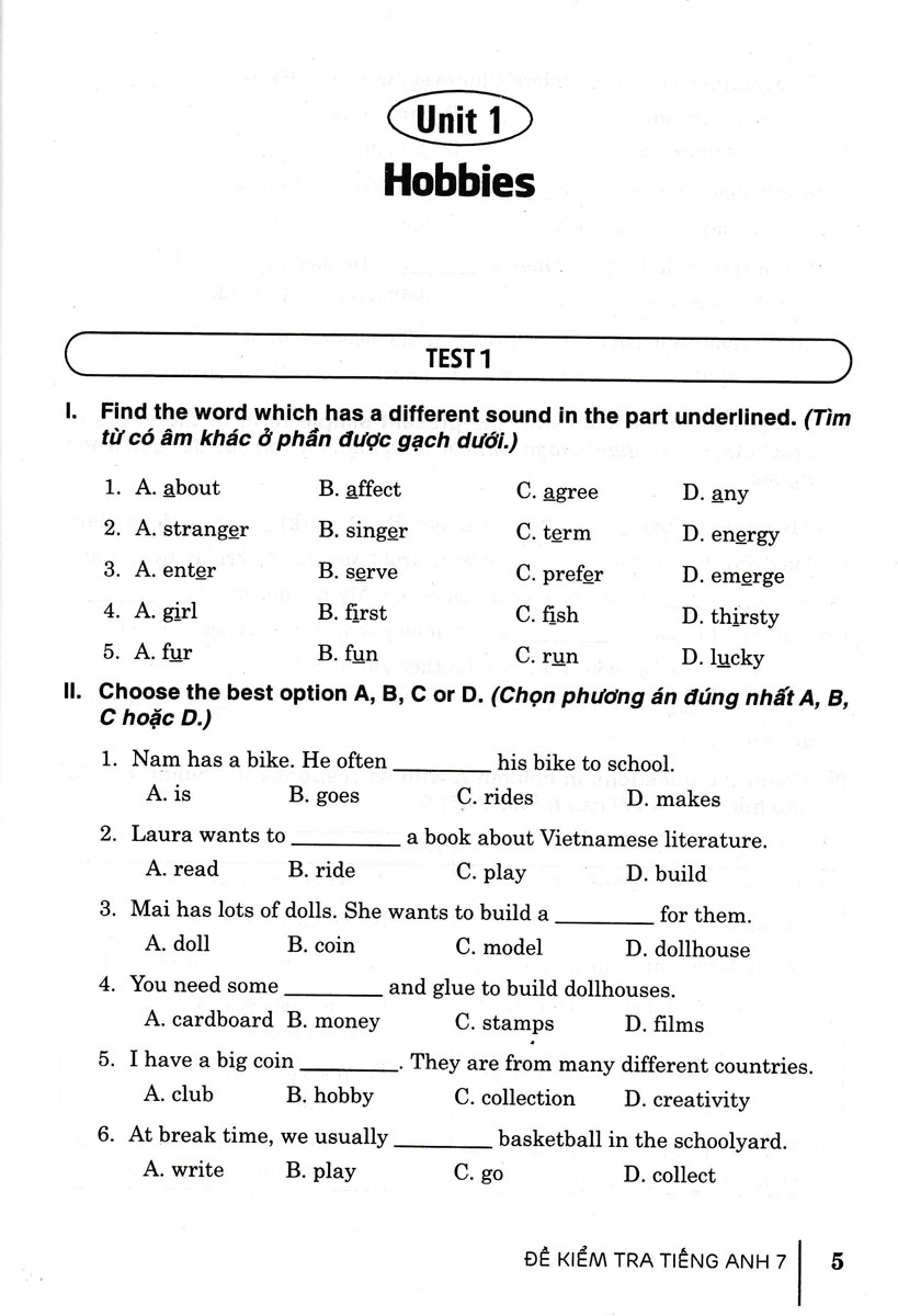 Sách bao gồm nhiều để kiểm tra với rất nhiều dạng khác nhau để các em luyện tập cách giải đề. Nội dung các đề kiểm tra bám sát các phần Ngữ âm, Từ vựng và Ngữ pháp, cũng như các chủ đề của mỗi bài học trong sách giáo khoa Tiếng Anh 7, hơn nữa còn được mở rộng thêm nên sẽ rất dễ dàng để các em vừa kiểm tra lại kiến thức đã học ở trường, vừa luyện tập và phát triển các kĩ năng phát âm, đọc, nói và viết.