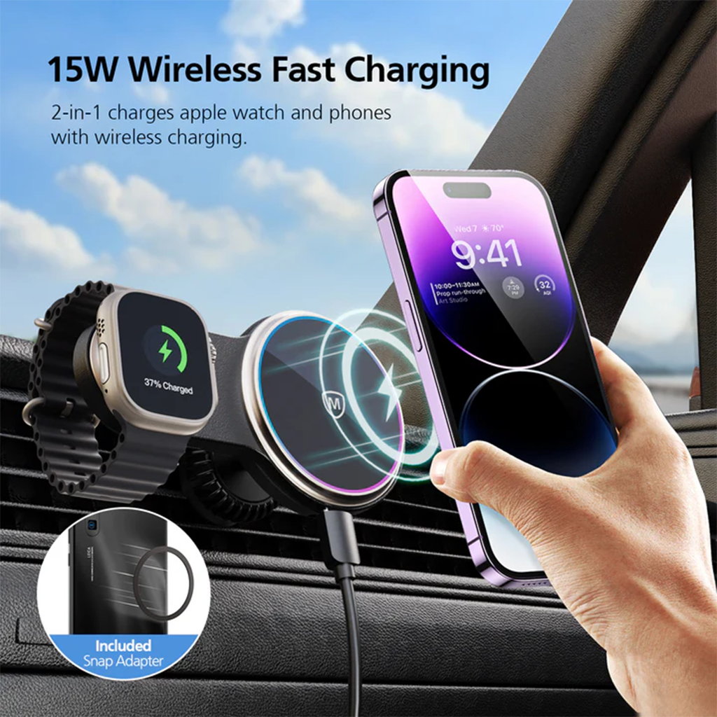 Bộ sạc gắn trên ô tô không dây từ tính 2 trong 1: Sạc cả điện thoại và đồng hồ thông minh của bạn cùng lúc bằng bộ sạc gắn trên ô tô 2 trong 1 đa năng này. Thiết kế từ tính đảm bảo giữ chặt, trong khi vị trí sạc đồng hồ thông minh xoay 180° để có sự tiện lợi tối ưu.