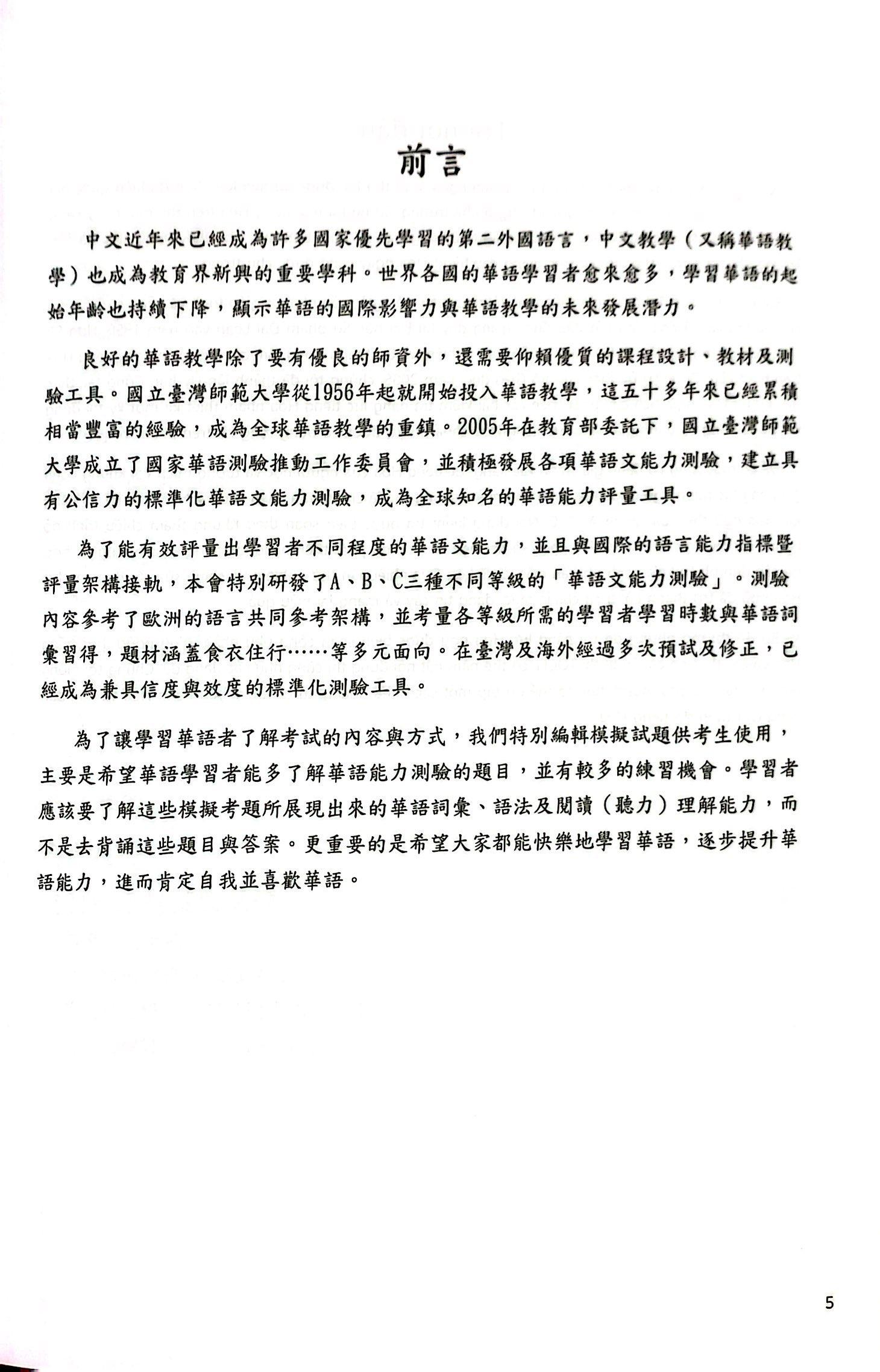 Để việc dạy học đạt hiệu quả thì ngoài đội ngũ giáo viên giỏi, cần phải có giáo trình và công cụ kiểm tra chất lượng cao. Tiếng Hoa bắt đầu được giảng dạy tại Đại học Sư phạm Đài Loan từ năm 45 dân quốc (năm 1956). Được sự ủy thác của Bộ Giáo dục, năm 2005, Đại học Sư Phạm Đài Loan đã thành lập Ủy ban Công tác thúc đẩy Kỳ thi Hoa ngữ, tích cực phát triển các bài kiểm tra năng lực tiếng Hoa nhằm thiết kế một kỳ thi năng lực Hoa ngữ có uy tín và được biết đến trên toàn cầu. Để có một công cụ đánh giá chính xác năng lực tiếng Hoa của người học và tương thích với Khung tham chiếu trình độ ngôn ngữ chung châu Âu, chúng tôi đã chú tâm nghiên cứu và triển khai Kỳ thi năng lực Hoa ngữ theo ba nhóm A, B, C. Nội dung kiểm tra được biên soạn bằng cách tham khảo số tiết học và sự phát triển năng lực Hoa ngữ của người học, đề cập đến nhiều khía cảnh như ăn, mặc, ở, đi lại, học hành, giải trí. Tuy nhiên, những bài thi này được thiết kế chủ yếu dành riêng cho những người đã học tiếng Hoa trên sáu tháng và có lẽ hơi khó đối với những người mới học.