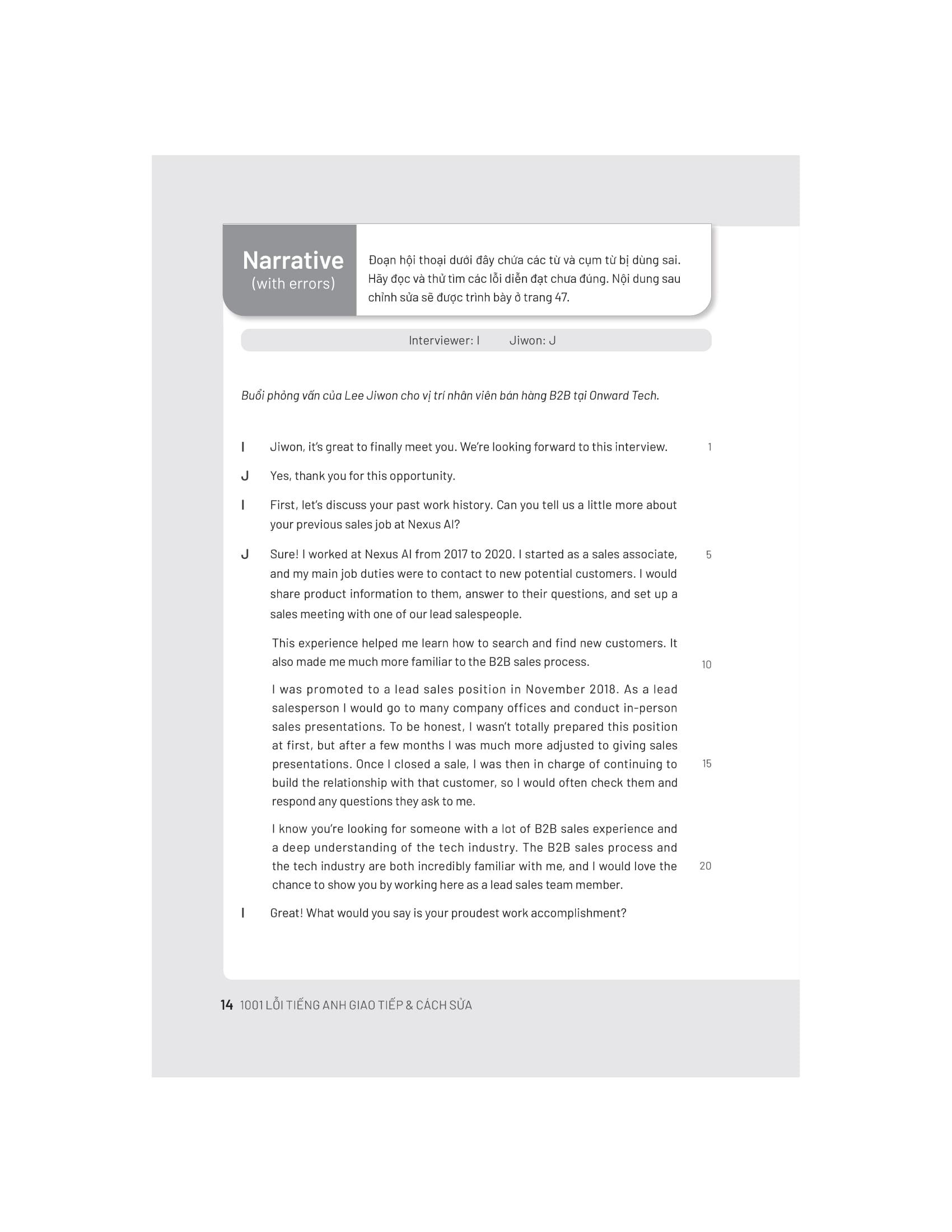 1001 lỗi tiếng Anh giao tiếp & cách sửa – Debug your English là cuốn sách tổng hợp các lỗi sai phổ biến mà người học tiếng Anh thường mắc và chia thành các nhóm lỗi lớn như lỗi dùng sai giới từ, lỗi ngữ pháp, lỗi dùng từ, lỗi diễn đạt thiếu tự nhiên. Từ các tình huống giao tiếp thực tế trong công việc, sách chỉ ra các lỗi sai và đề xuất cách sửa, giải thích sắc thái của từ, đồng thời cung cấp thông tin mở rộng và ví dụ ứng dụng.