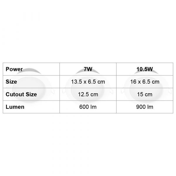 Đường kính khoét lỗ / Công suất: 110/12W. Dải điện áp hoạt động: (150V - 250V)/50Hz Quang thông: 930lm/910lm Nhiệt độ màu: Sáng trắng 6500K/ Sáng vàng 3000K Kích thước (ØxH): (138x50)mm ĐK lỗ khoét