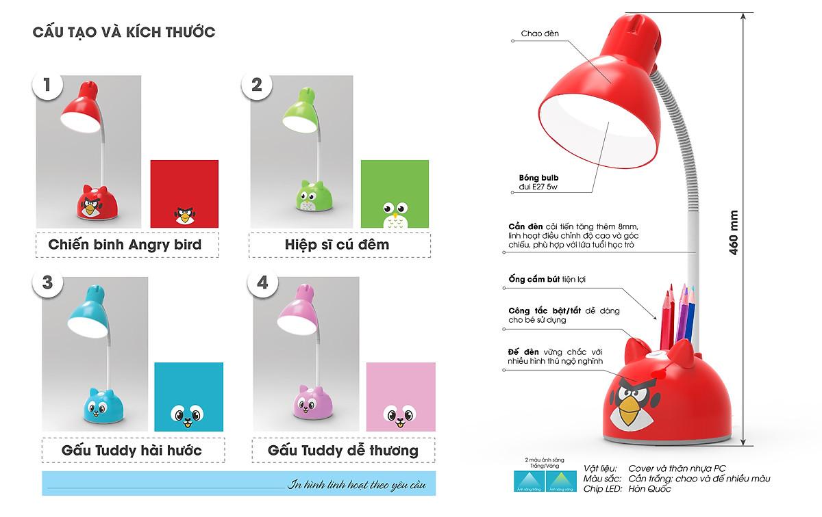 Đèn Bàn Rạng Đông Chống Cận LED 5W • Model: • Công suất: 5W/7W • Điện áp: 220V/50Hz • Nhiệt độ màu: 6500K (Trắng)/ Vàng(3000K)/ Đổi 3 màu ánh sáng • Màu đèn: Xanh/ Hồng