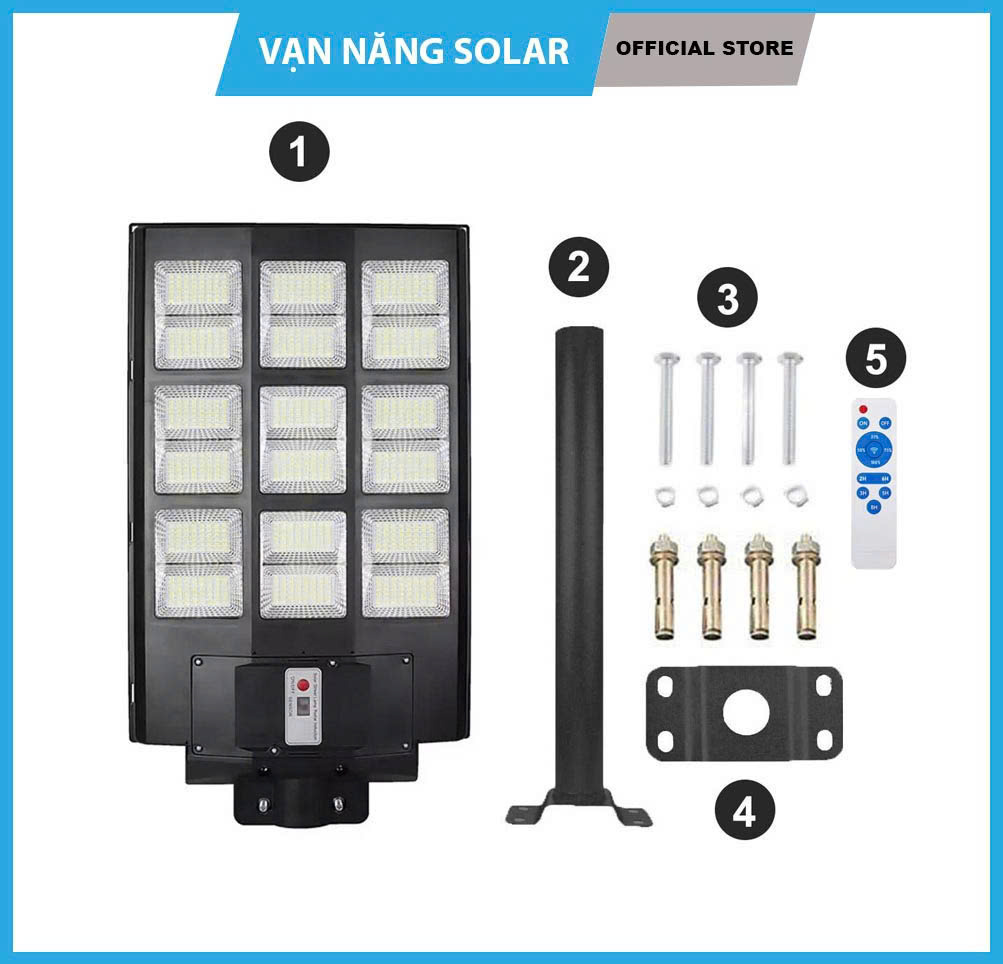 Thông số kỹ thuật: Đèn đường 450W Vật liệu vỏ: nhựa ABS Thời gian nắng để sạc : 6-8h Thời gian chiếu sáng: 8h-12h Điện áp: 6V 25w kích thước đèn :595340mm kích thước tấm pin : 510335mm Cấu tạo nguồn sáng: 864 hạt led to 5730 Chức năng: Cảm biến thường và chuyển động, cài đặt bằng 1 nút bấm trên remote kèm theo Bộ sản phẩm gồm như trong hình: