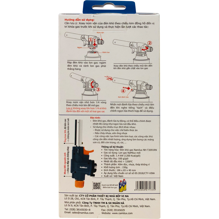 Đèn khò gas NaMilux dùng bình gas mini với cách sử dụng cực kỳ đơn giản. Sản phẩm trang bị hệ thống đánh lửa tự động, công suất đốt cực mạnh 1400W có khả năng tạo ra ngọn lửa nơi đầu khò sắc nét với nhiệt độ lên đến 1200 độ C. Bạn có thể dễ dàng điều chỉnh nhiệt độ khò.