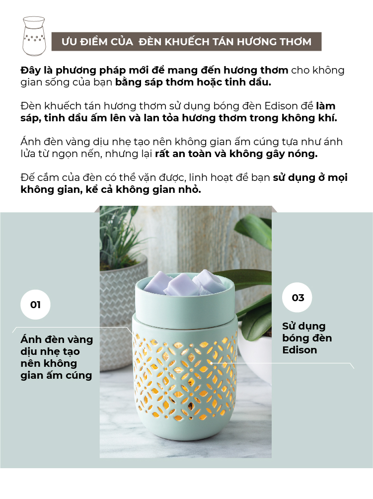 Đèn khuếch tán hương thơm sử dụng bóng đèn Edison để làm sáp ấm lên và tan chảy trong đĩa, từ đó lan tỏa hương thơm trong không khí. HƯỚNG DẪN SỬ DỤNG