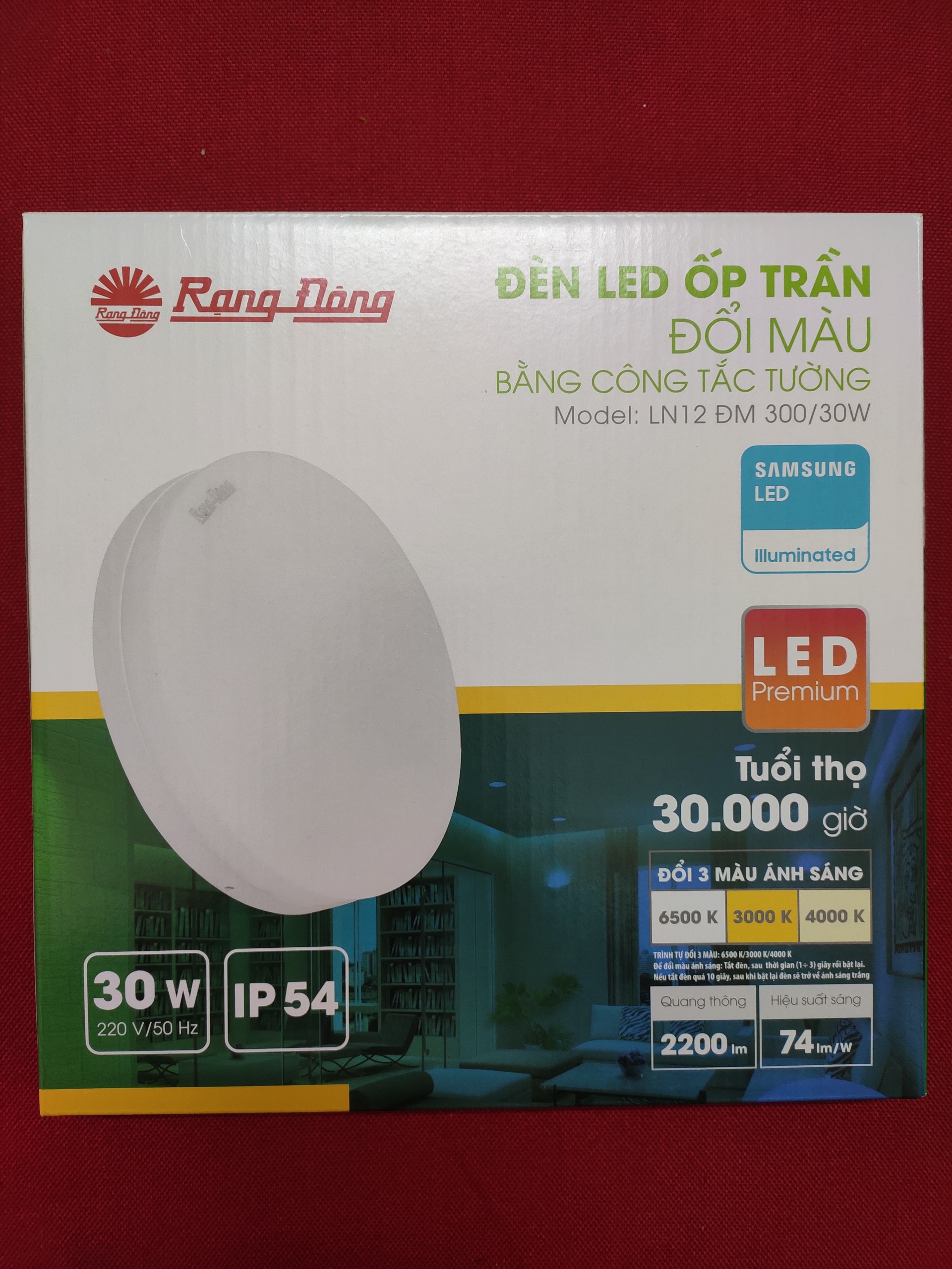 THÔNG SỐ KỸ THUẬT: ·        Model  :   Tròn LN12 ĐM 300/30W; Vuông LN12 ĐM 300x300/30W ·        Công suất:   30W ·        Cấp bảo vệ: IP54 ·        Thay thế cho đèn ốp trần sợi đốt 200W ·        Kích thước của đèn (RxC):    280 x 36 (mm) ·        Vật liệu:    Kim loại và Mica ·        Nguồn điện danh định:    220/50 HZ ·        Điện áp có thể hoạt động:    150V-250V ·        Dòng điện (Max):    320 mA ·        Hệ số công suất:    0.5 ·        Quang thông:    2200lm/1800lm ·        Hiệu suất anh sáng:    83lm/W – 75lm/W ·        Nhiệt độ  03 màu ánh sáng : Ánh sáng trắng, sáng trung tính và sáng vàng – 6500K/4000K/3000K ·        Hệ số trả màu(CRI):    80 ·        Tuổi thọ:    30.000 giờ ·        Chu kỳ tắt bật:    50.000 lần ·        Mức tiêu thụ điện trong 1000 giờ:    30kWh ·        Thời gian khởi động của đèn:   <0.5 giây ·        Đáp ứng tiêu chuẩn chiếu sáng Việt Nam TCVN 7114: 2008 ·        Đáp ứng Tiêu chuẩn Việt Nam (TCVN), Quốc tế (IEC): TCVN 7722-1:2009/ IEC 60598-1: 2008: về đèn điện Ưu điểm của đèn ốp trần 30W đổi màu ·         Tiết kiệm đến 90 % điện năng: -         Tiết kiệm 90% điện năng thay thế đèn sợi đốt -         Tiết kiệm 45%-50% điện năng thay thế đèn compact.Giúp giảm chi phí hóa đơn tiền điện ·        Thay đổi 3 màu ánh sáng trên cùng một đèn bởi chức năng tắt bật công tắc: Sáng trắng, sáng trung tính và sáng vàng ·        Tuổi thọ cao: Tuổi thọ cao 30.000 giờ, độ tin cậy cao, không hạn chế số lần bật tắt: -         Cao gấp 15 lần so với bóng đèn sợi đốt -         Cao gấp 2-3 lần so với đèn copmact  ·        Dải điện áp hoạt động rộng:  Đèn LED có dải điện áp rộng (150-250V) ánh sáng và công suất không thay đổi khi điện áp lưới thay đổi Tương thích điện từ trường không gây ra hiện tượng nhiễu cho sản phẩm điện tử và không bị ảnh hưởng nhiễu của các thiết bị điện tử khác ·        Hệ số trả màu (CRI > 80): Hệ số trả màu cao (CRI > 80), ánh sáng trung thực tự nhiên Tăng khả năng nhận diện màu sắc của vật được chiếu sáng Đáp ứng tiêu chuẩn chiếu sáng Việt Nam TCVN 7114: 2008  ·        Đáp ứng Tiêu chuẩn Việt Nam (TCVN), Quốc tế (IEC): TCVN 7722-1:2009/ IEC 60598-1: 2008: về đèn điện  ·        Thân thiện môi trường: Không chứa hóa chất độc hại, không phát ra tia tử ngoại, an toàn cho người sử dụng Ứng dụng: Chiếu sáng hộ gia đình, căn hộ, tòa nhà: Hành lang, ban công…