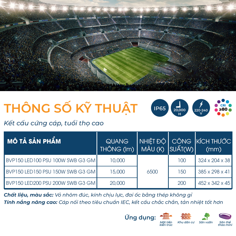 Dòng đèn Pha Philips LED BVP150 G3 có dải công suất rất rộng từ 100W đến 200W với màu ánh sáng trắng (6500K), độ kín IP65 và tuổi thọ lên đến 20.000 giờ đem đến tính ứng dụng đa dạng cho nhiều loại mặt tiền kiến trúc, khu dân cư, sân vườn, sân thể thao mini, bảng hiệu, ... bất kể là trong nhà hay ngoài trời.