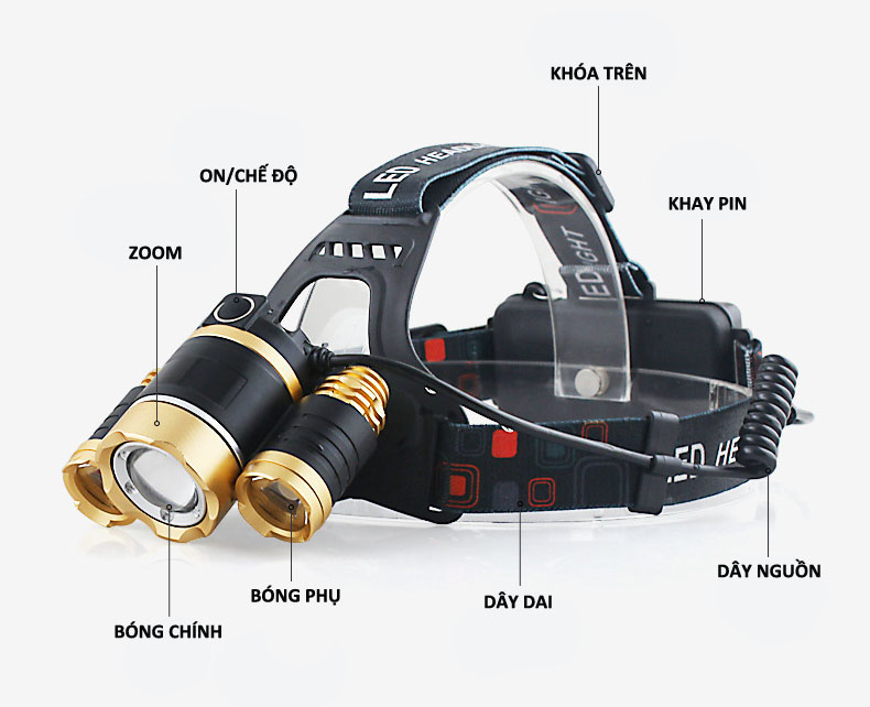 Đèn Pin LED siêu sáng đội đầu được thiết kế gọn nhẹ, đẹp, sang trọng và rất tiện dụng. Với độ sáng có thể lên tới 5000 Lumens khi bật toàn bộ 3 đèn, có thể điều chỉnh góc chiếu, có thiết bị báo đỏ phía sau.