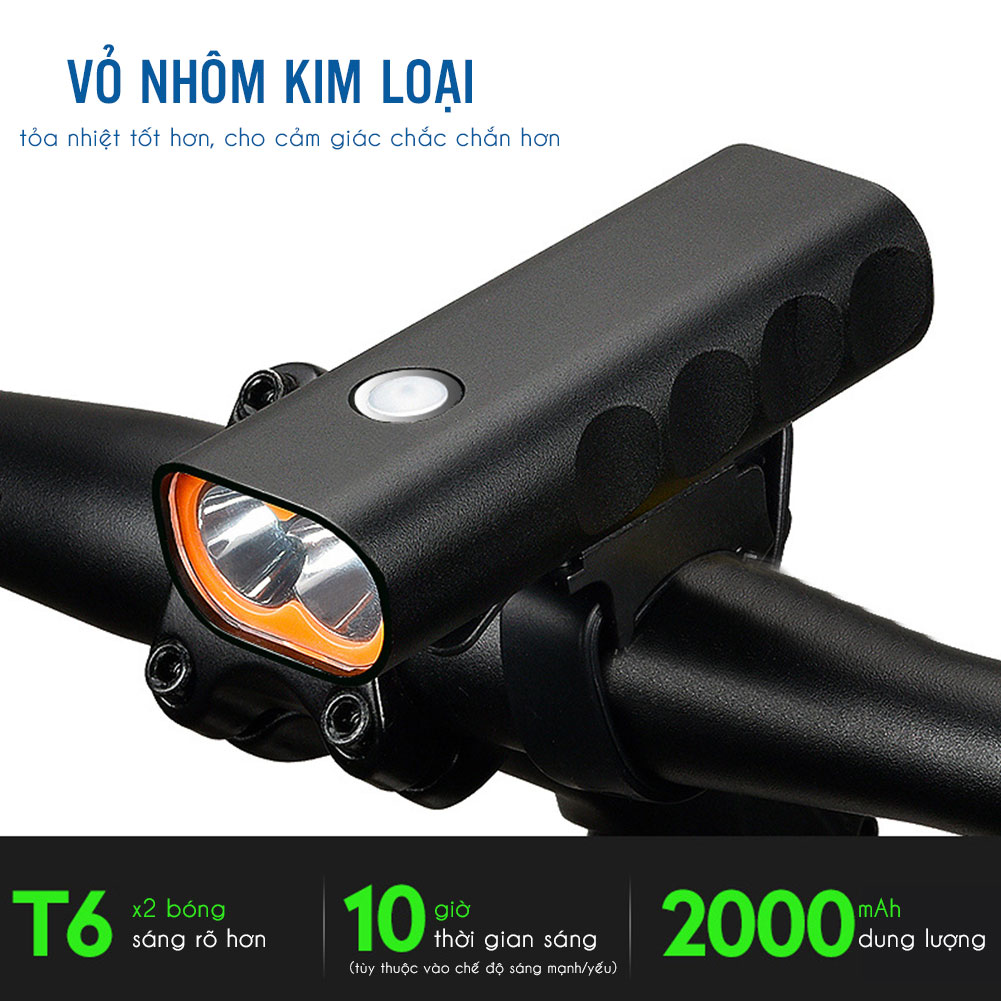 Đèn Xe Đạp Mini Nhỏ Gọn 2 Bóng LED T6 Độ Sáng Cao Vỏ Nhôm Chống Nước Dung Lượng Pin 2000mAh Sạc Điện Mai Lee