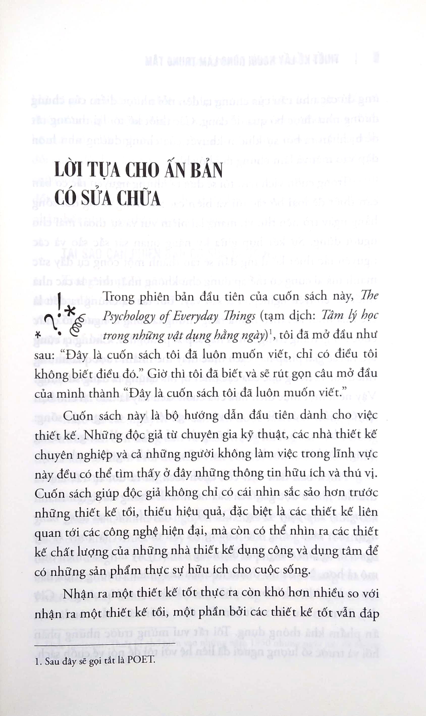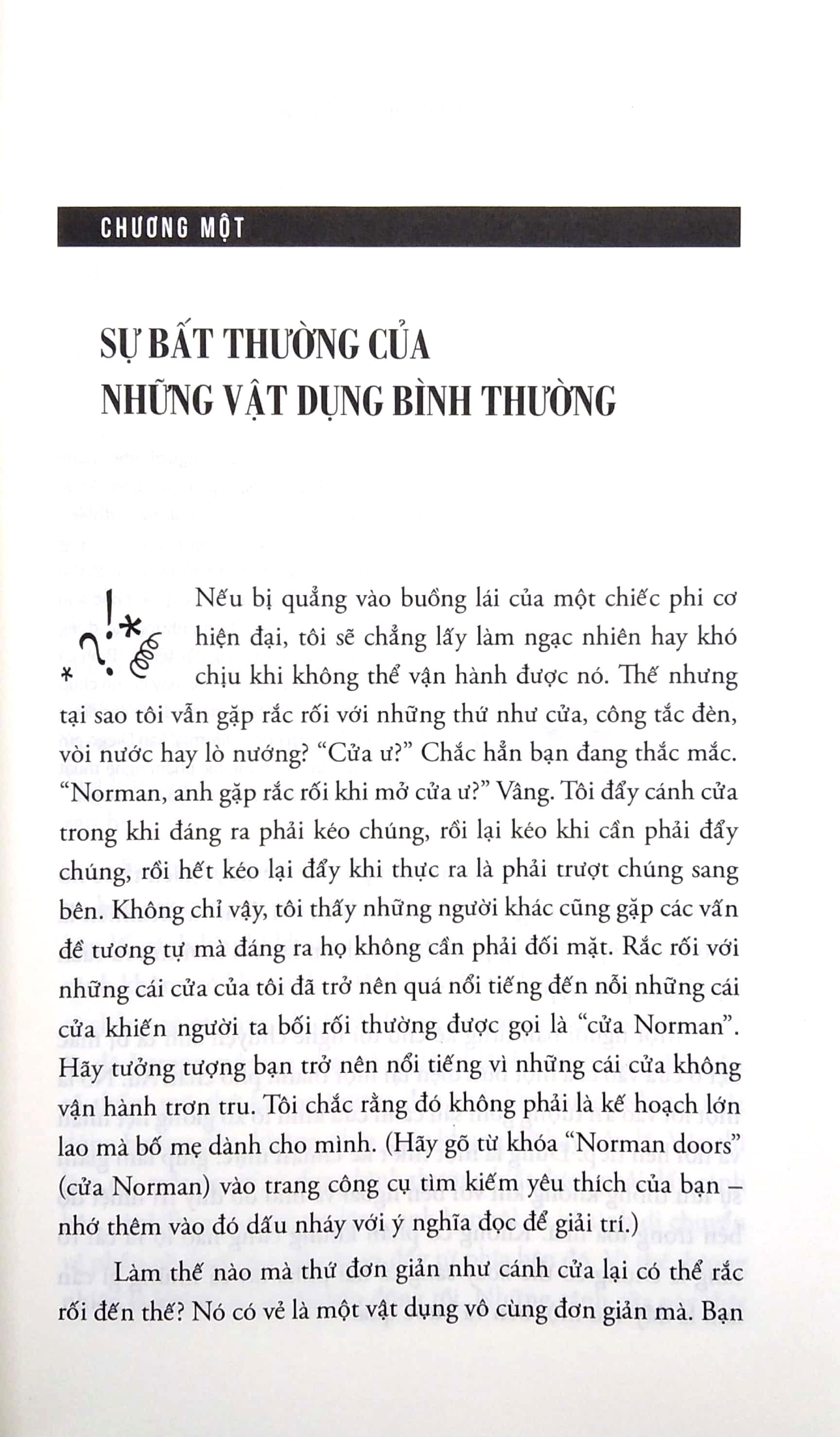 Design - Thiết Kế Lấy Người Dùng Làm Trung Tâm Tất cả chúng ta đều là nhà thiết kế! Dù không theo nghề thiết kế chuyên nghiệp, hằng ngày, chúng ta vẫn phải tự thiết kế cuộc sống, sắp xếp chỗ ở hay tổ chức cách làm việc khoa học. Vì thế, cuốn sách tuyệt vời này không chỉ dành cho các nhà thiết kế, các chuyên gia kỹ thuật mà phù hợp với tất cả mọi người. Cuốn sách giúp độc giả trở thành các nhà quan sát sắc sảo trước những thiết kế kém cỏi và ngớ ngẩn đang gây ra rắc rối cho cuộc sống của con người, đặc biệt là những sản phẩm liên quan tới công nghệ hiện đại. Don Norman sẽ khiến bạn phải gật gù tâm đắc khi phân tích thiết kế của các vật dụng thường ngày, từ bồn rửa tay, cánh cửa, ghế ngồi cho tới điện thoại hay giao diện phần mềm. Không chỉ vậy, Norman còn chỉ ra các nguyên tắc dựa trên tâm lý học nhận thức để thiết kế mọi thứ đúng đắn, khoa học. Bộ đôi này đã trở thành công cụ đầy sức mạnh để khiến cuộc sống của chúng ta trở nên thú vị, thoải mái và nhiều niềm vui hơn.