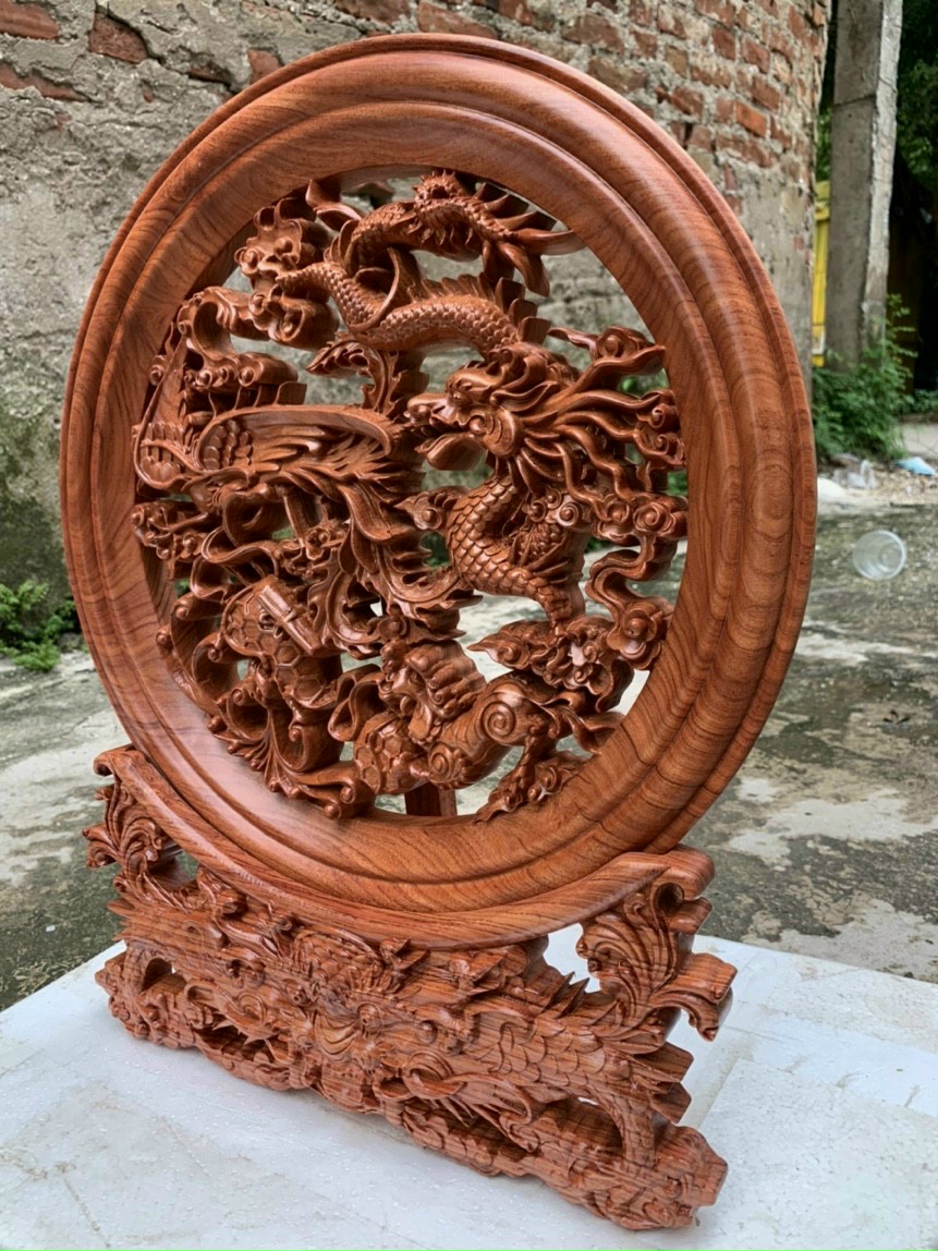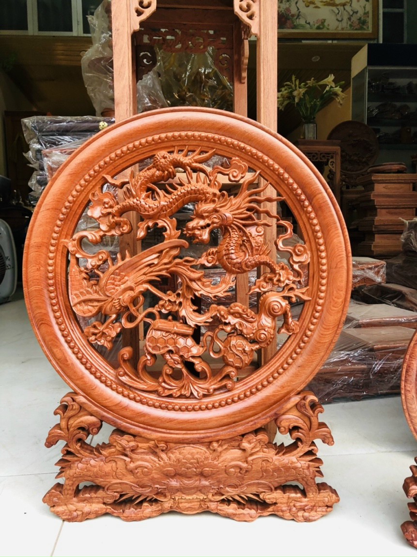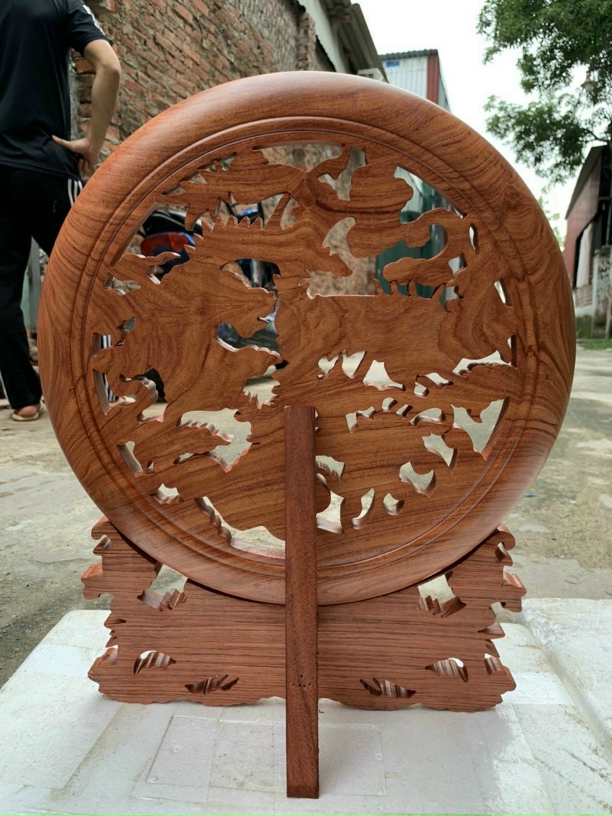 Đĩa trang trí phong thủy trạm khắc tứ linh được làm bằng chất liệu gỗ hương đá tự nhiên 100%  Kích thước mặt tròn 45cm dầy 4cm + chân đế cao 10cm =tổng cao cả chân đế là 55cm _ Đĩa trang trí phong thủy được trạm khắc vô cùng tỉ mỉ ,tinh sảo kỳ công .Đi hầu hết tất cả mọi phía cạnh góc ngách nội dung hoa văn của đĩa .Đều được gọt tỉa ,chỉnh sửa hoàn toàn bằng tay thủ công .Đồng thời đĩa được kiểm định kỹ lưỡng ,Như cho vào thẩm sấy cho gỗ khô kiệt .Mục đích trống dập nứt vênh mo mối mọt ,Kết hợp với trà nhám ,đánh giấy giáp nhiều nước sờ mát lạnh ,Rồi cho vào phun lót làm bóng mờ .Để giữ lại mầu sắc vân gỗ tự nhiên ,Đĩa khắc tứ linh được làm và hoàn thiện ,do bàn tay khối óc tài hoa ,Từ những người thợ giàu kinh nghiệm ,Cũng như tay nghề cao trong làng nghề truyền thống .Chính vì thế đĩa đã đáp ứng đầy đủ những tiêu trí ( Đẹp bền rẻ ) Thẩm mỹ nghệ thuật với chất lượng tuyệt vời