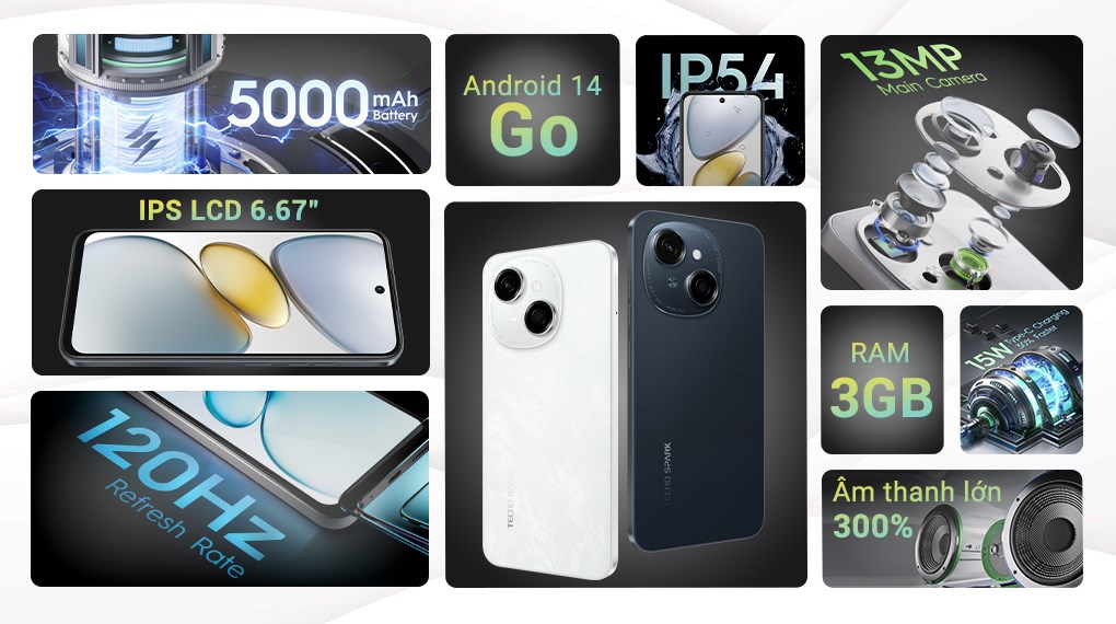 Ngoài ra, TECNO Spark Go 1 còn được hỗ trợ nhiều tiêu chuẩn kết nối mạng không dây khác, như: Wi-Fi 5, hỗ trợ kết nối mạng nâng cao 4.5G, Bluetooth 5.2, cổng cắm tai nghe 3.5 mm và cổng sạc USB Type-C. Về mặt phần mềm, Spark Go 1 được chạy trên hệ điều hành Android 14 Go.