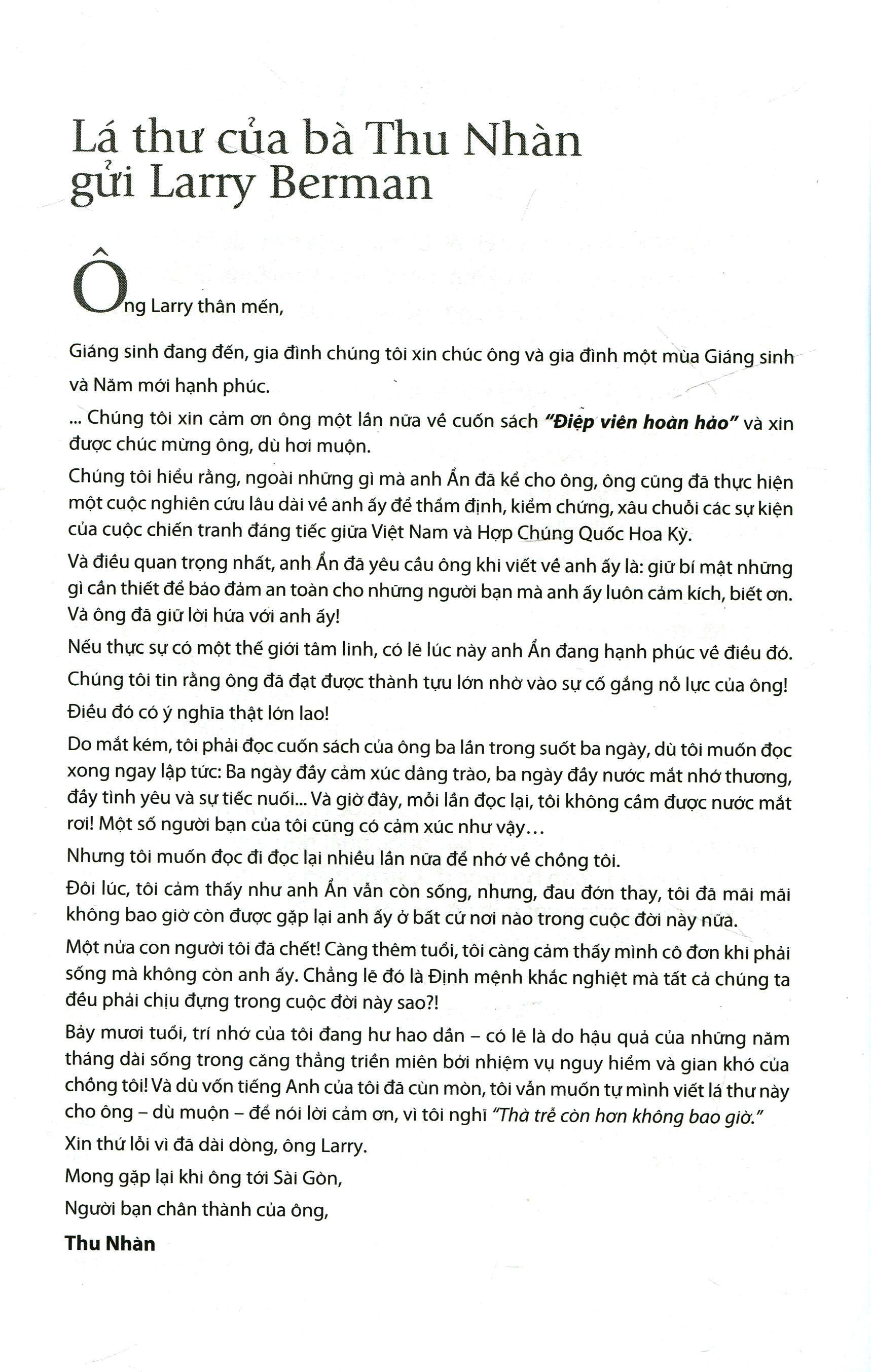Đặc biệt trong lần in mới này công bố bức thư xúc động của bà Thu Nhàn, vợ thiếu tướng Phạm Xuân Ẩn, gửi tác giả Larry Berman: “Do mắt kém, tôi phải đọc cuốn sách của ông ba lần trong suốt ba ngày, dù tôi muốn đọc xong ngay lập tức: ba ngày đầy cảm xúc, ba ngày đầy nước mắt nhớ thương, đầy tình yêu và sự tiếc nuối… Và giờ đây, mỗi lần đọc lại là tôi không cầm được nước mắt! Một ít người bạn của tôi cũng có cảm xúc như vậy… Nhưng tôi muốn đọc lại nhiều lần để nhớ về chồng tôi.