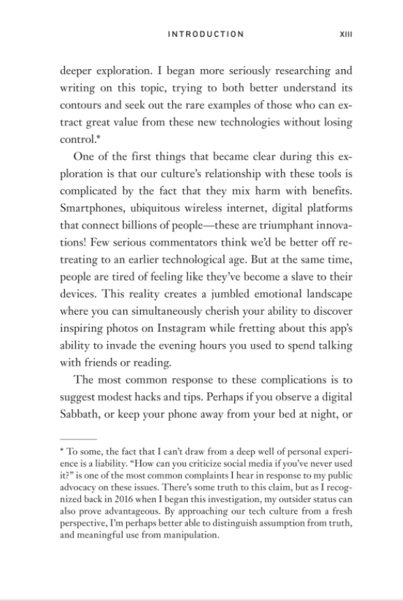 Now, Newport gives us a name for this quiet movement, and makes a persuasive case for its urgency in our tech-saturated world. Common sense tips, like turning off notifications, or occasional rituals like observing a digital sabbath, don't go far enough in helping us take back control of our technological lives, and attempts to unplug completely are complicated by the demands of family, friends and work. What we need instead is a thoughtful method to decide what tools to use, for what purposes, and under what conditions.