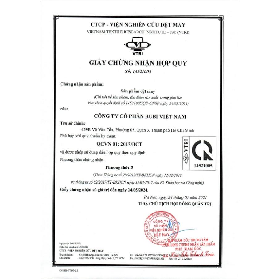 Các sản phẩm của ĐỊU VẢI BUBI đều đạt chuẩn hợp quy của viện nghiên cứu dệt may Ngày 24/5/2021, Công ty Cổ Phần BUBI Việt Nam được Viện nghiên cứu dêt may cấp DẤU CHỨNG NHẬN HỢP QUY CR cho thương hiệu Địu vải BUBI. Các sản phẩm của Địu vải BUBI được công nhận hàm lượng Formaldehyt và các Amin thơm tồn dư chuyển hóa từ thuốc nhuộm Azo trong các sản phẩm dệt may lưu hành trên thị trường Việt Nam đáp ứng tiêu chuẩn (QCVN 01.2017/BCT).