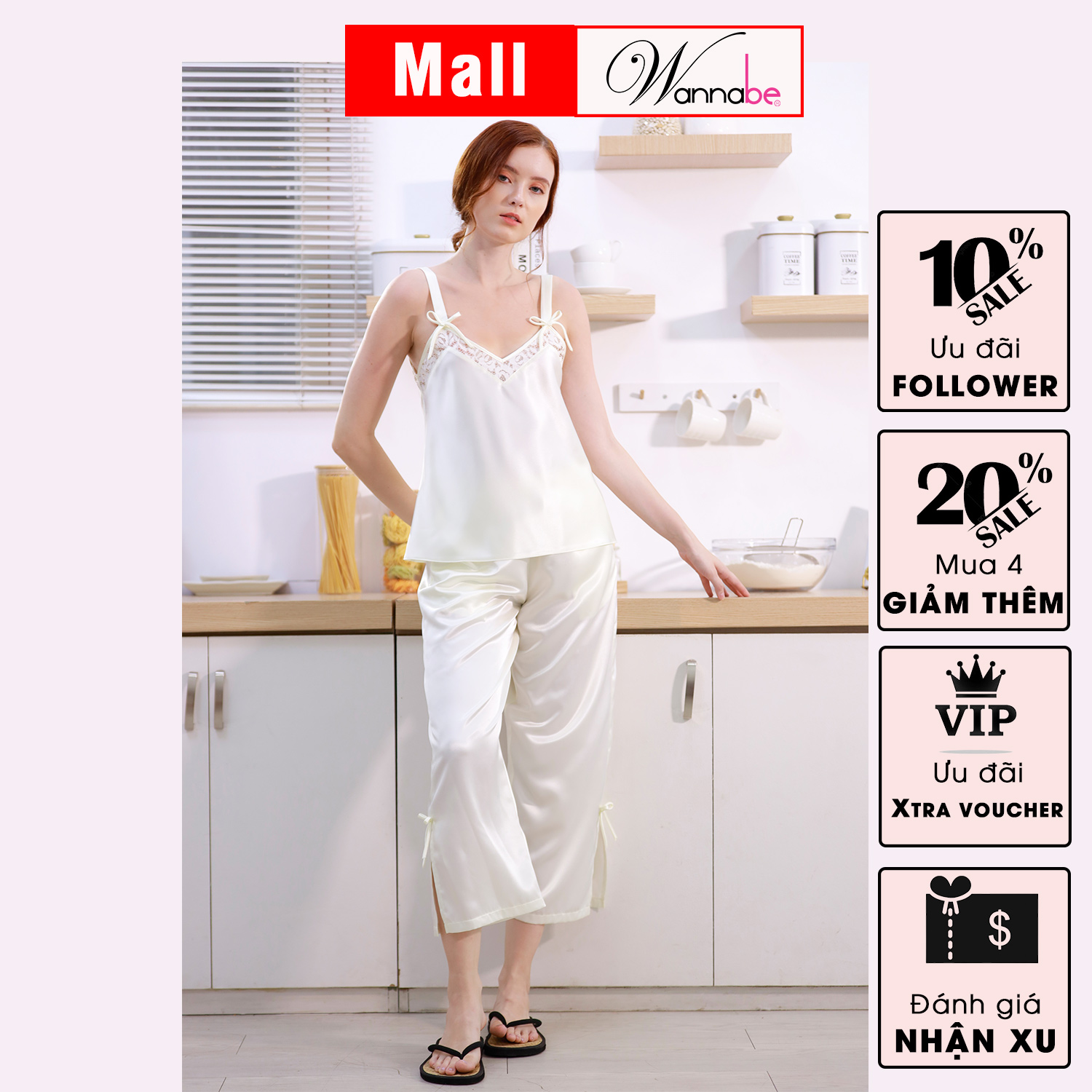 Đồ bộ mặc nhà WANNABE BDS41 đồ bộ quần dài phối áo 2 dây cúp ngực viền ren gợn sóng mang lại vẻ gọn gàng nữ tính Đồ bộ mặc nhà phi lụa cao cấp