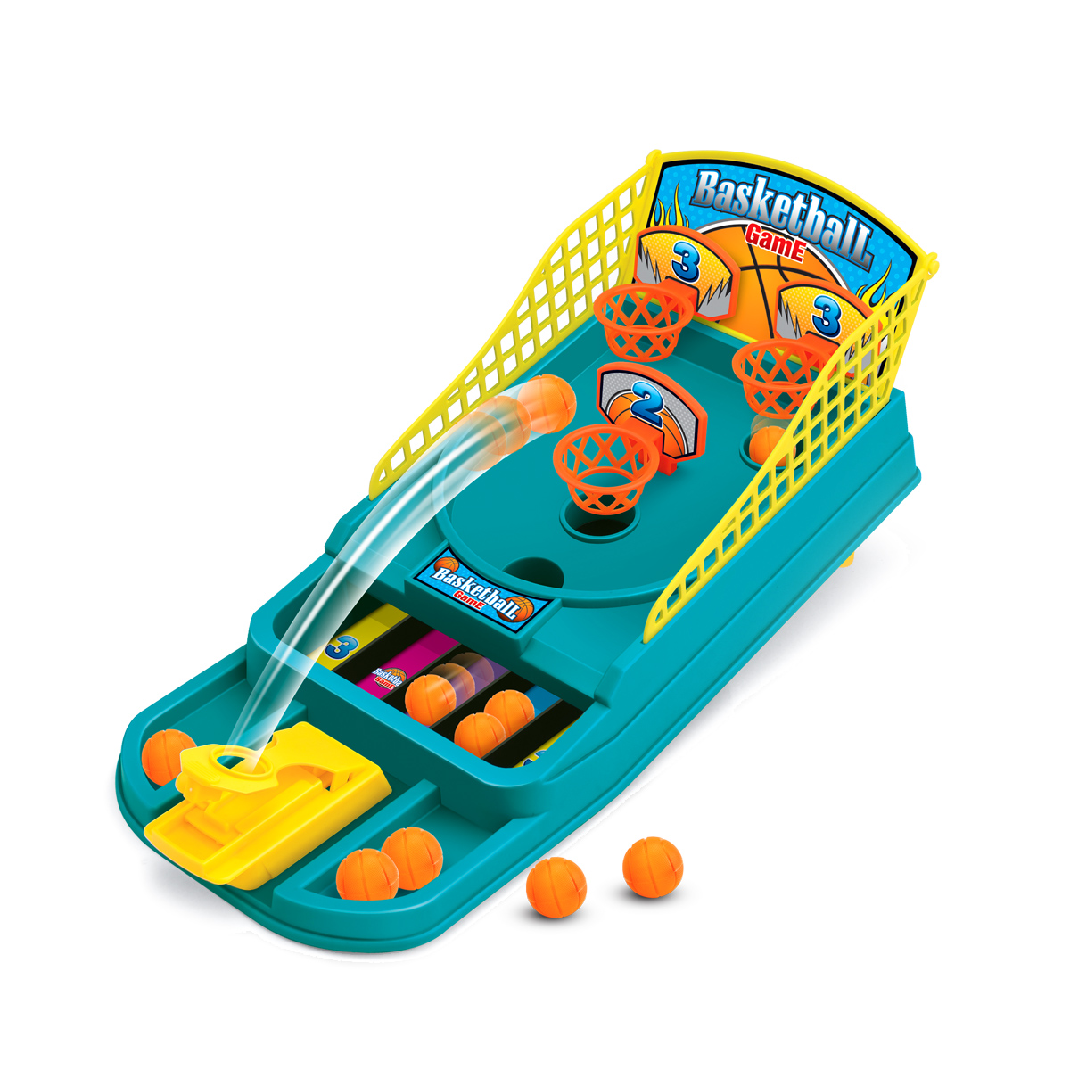 - Sản phẩm bao gồm: bàn chơi có ống bắn bóng tạo lực, rổ bóng 3 lỗ tính điểm, rãnh lăn bóng.