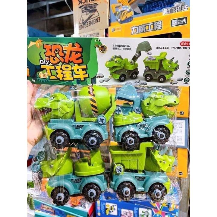 Set 4 xe lắp ghép khủng long công trường, xe ô tô đồ chơi tặng kèm tovit, cờ lê cho bé