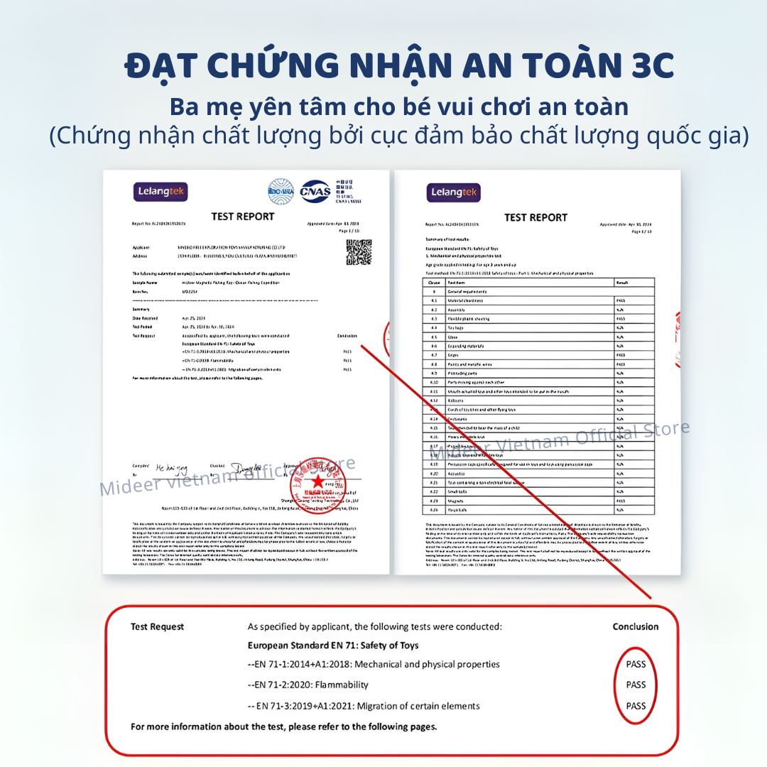 - ĐẠT CHỨNG NHẬN AN TOÀN 3C: Được kiểm định và chứng nhận chất lượng bởi cục đảm bảo chất lượng quốc gia, mang đến sự an tâm cho ba mẹ khi bé chơi.