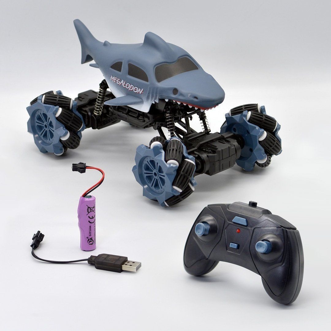 XE ĐIỀU KHIỂN TỪ XA 2.4G - CÁ MẬP VÔ ĐỊCH Đồ chơi xe điều khiển được thiết kế với mô hình chú cá mập ngộ nghĩnh, chất liệu hợp kim độ bền cao, bánh