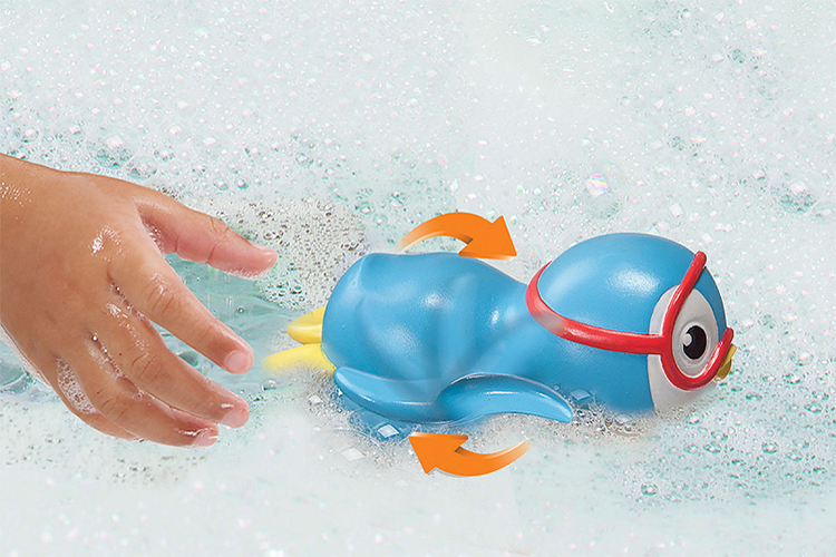 Lên dây cót bằng cách quay 2 cánh tay của chú chim cánh cụt, rồi thả ra, chú sẽ tự bơi.