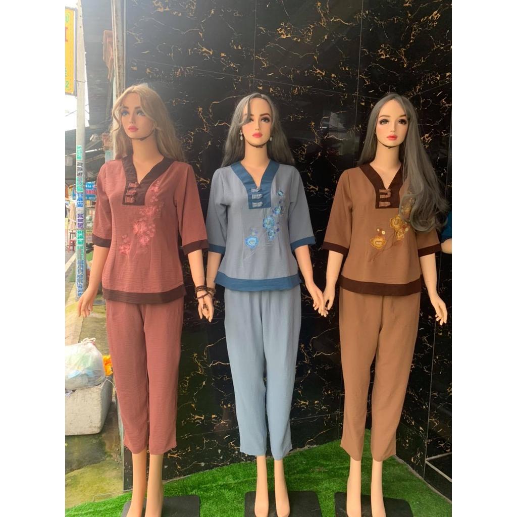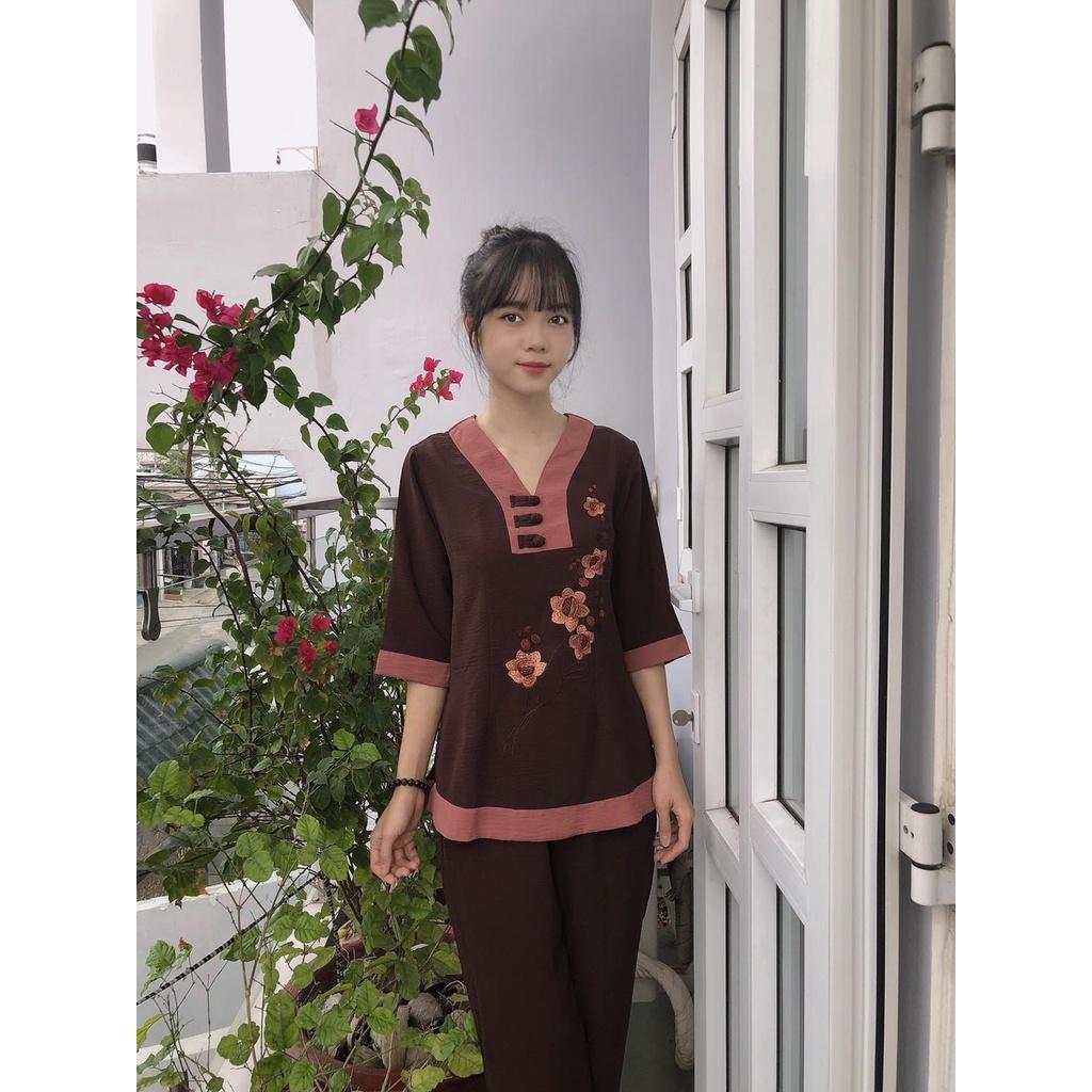 Đồ bộ đi chùa vải đủi vân may thêu hoa sen và chữ An
