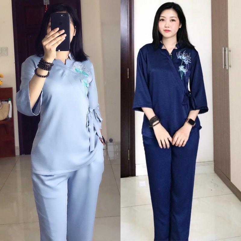 Mẫu pháp phục nữ - quần áo Phật tử đi chùa, đồ lam chất kate lụa mềm có co giãn Sen Hồng 0898553583