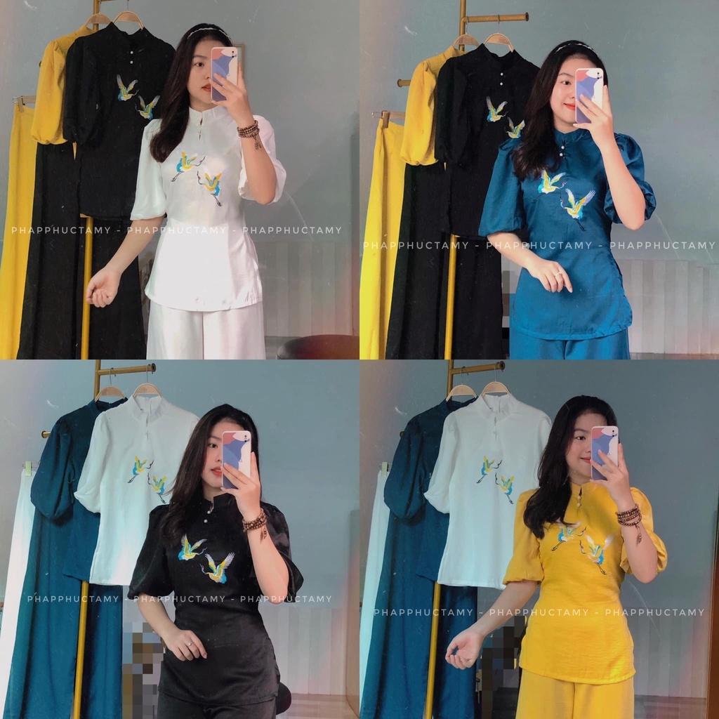 Quần áo phật tử, đồ lam đi chùa mẫu lụa thêu chim Hạt A52A, shop Hồng Phúc An