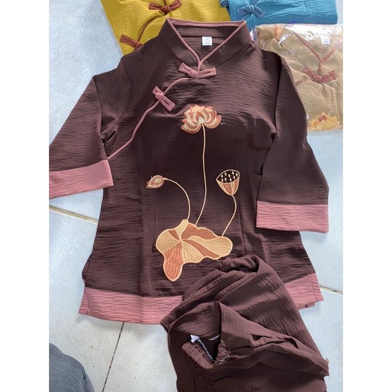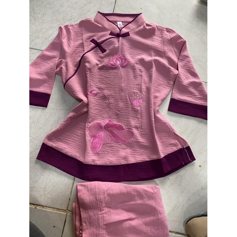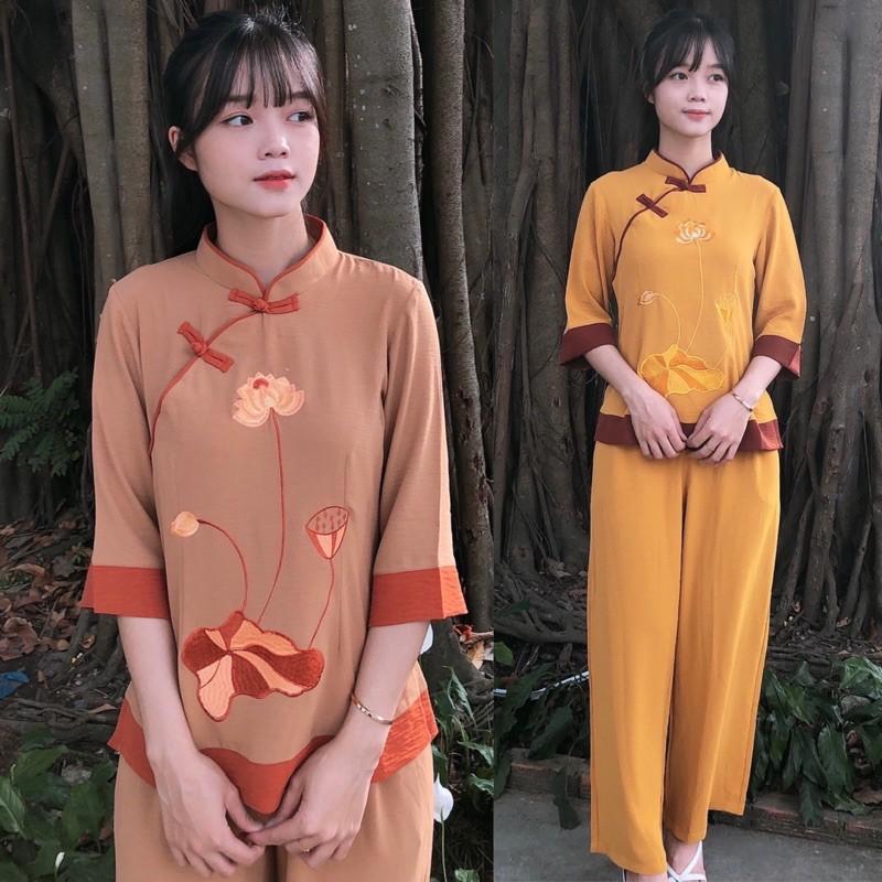 Mẫu pháp phục nữ - quần áo Phật tử đi chùa, đồ lam chất kate lụa mềm có co giãn Sen Hồng 0898553583