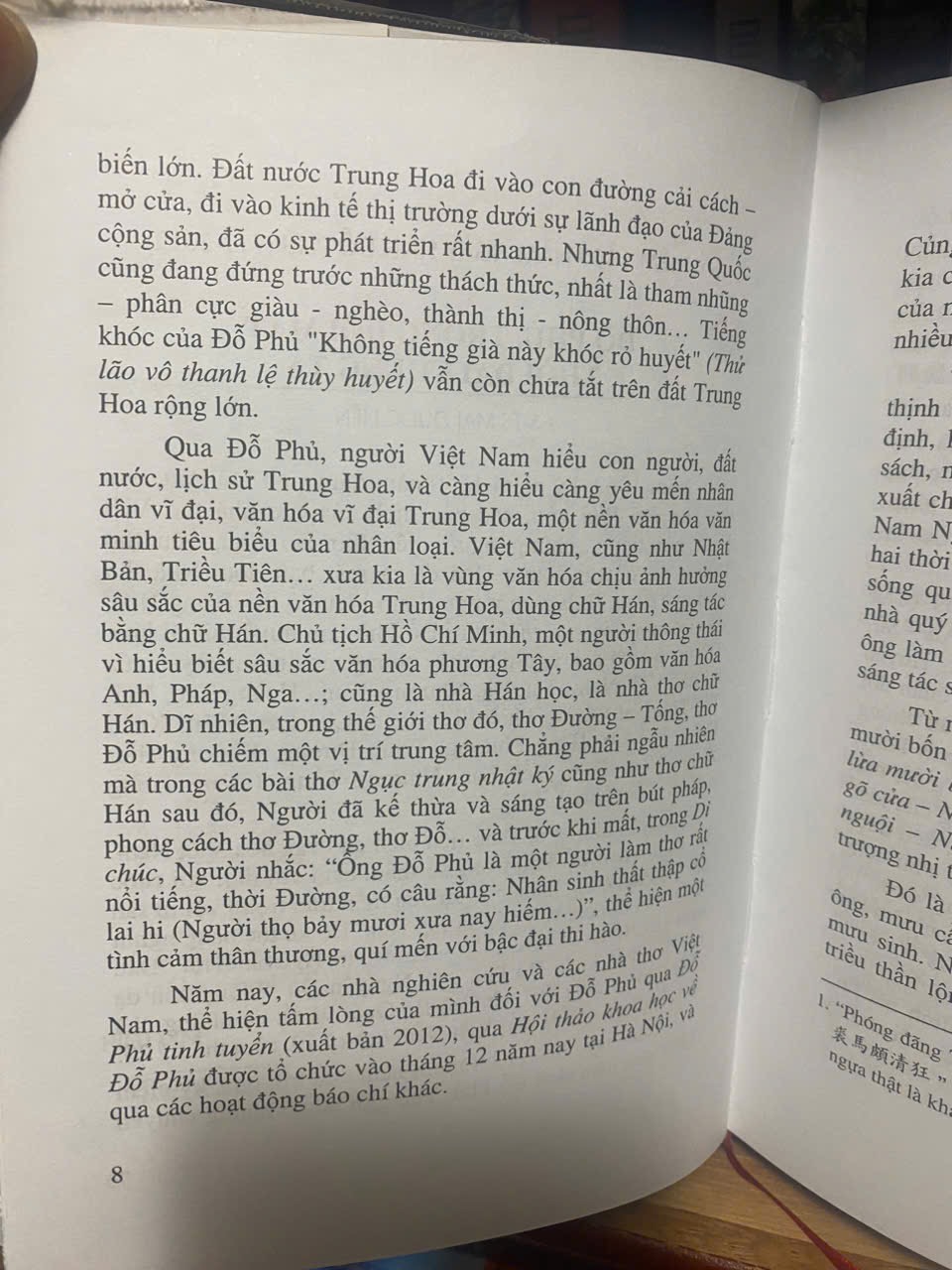 Thơ Đường là một trong những đỉnh cao văn hóa không chỉ của Trung Quốc mà còn của toàn nhân loại. Trong suốt bốn thế kỷ thịnh trị (từ thế kỷ thứ 7 đến thứ 10), thơ Đường đã xuất hiện hàng loạt những tác giả nổi tiếng với các thi phẩm bất hủ như Trương Khế với Phong Kiều dạ bạc, Trần Tử Ngang với Đăng U châu đài ca, Vương Chi Hoán với Xuất tái, Đăng quán tước lâu, Vương Xương Linh với Phù dung lâu tống Tân Tiệm, Thôi Hiệu với Hoàng hạc lâu, Bạch Cư Dị với Tì bà hành, Trường hận ca… nhưng trong số những “quần anh tụ hội” đó không ai có sức hấp dẫn và ảnh hưởng sâu rộng đối với người đời sau này như hai bậc “thi tiên” Lý Bạch và “thi thánh” Đỗ Phủ. Tài năng của hai bậc thi nhân là một phần quan trọng đưa thơ Đường đạt đến tầm thời đại “Phục hưng” như lời nhận định của viện sĩ Konrad trong Đông phương học.Từ trước đến nay đã có rất nhiều công trình, tuyển tập về hai bậc danh nhân văn hóa này ở Trung Quốc và trên khắp thế giới, trong đó có Việt Nam. Và nhân dịp kỷ niệm 1300 năm ngày sinh Đỗ Phủ (712-2012), Trung tâm nghiên cứu Quốc học đã cho ra mắt bạn đọc một ấn phẩm mới về ông: Đỗ Phủ tinh tuyển.Đúng như tính chất “tinh tuyển”, cuốn sách chỉ chọn 100 bài thơ trong tổng số 1400 bài còn lưu truyền đến hiện nay của tác giả. Khi lựa chọn con số một trăm chứ không phải các con số khác hẳn các soạn giả cũng có lý lẽ của riêng mình. Cá nhân tôi thấy một trăm là con số đẹp thể hiện sự tròn đầy, viên mãn qua đó nói lên được sức sống “bất tử” của thơ Đỗ Phủ đối với nhân loại.100 bài thơ trong tuyển tập hầu hết là những bài đã khá quen thuộc với công chúng yêu thơ nước nhà. Nhiều bài được trích giảng trong các bộ sách giáo khoa (cũ và mới) như Thu hứng, Tuyệt cú, Thạch hào lại, Mao ốc vi thu phong sở phá ca…. Mỗi bài thơ trích dẫn đều có chú thích về thời điểm sáng tác, hoàn cảnh sáng tác để công chúng tiện theo dõi, nắm được hành trình thơ Đỗ Phủ qua các giai đoạn khác nhau. Đây là việc làm hết sức khoa học, vừa tạo điều kiện dễ dàng hơn cho bạn đọc phổ thông tìm hiểu thơ Đỗ Phủ, vừa tạo sự thuận lợi cho những nhà nghiên cứu.Các soạn giả cũng chú ý đến tính chỉnh thể, đa dạng trong việc tuyển chọn thơ Đỗ Phủ. 100 bài thơ được các nhà tuyển chọn chia đều cho các thể thơ Đường như thể hành , thất ngôn bát cú, tuyệt cú, ngũ ngôn… Số lượng mỗi thể tương đương nhau gồm khoảng hai mươi, ba mươi bài. Nội dung các bài tuyển chọn cũng phong phú, vừa có dạng thơ biên tái xót xa trước những cảnh khổ cực của người dân trong thời loạn, vừa có thể thơ đăng cao bày tỏ nỗi lòng của bậc phu tử, vừa có thể thơ hoài, ức nhớ bạn bè, người thân trong gia đình vừa có thể thơ ngâm vịnh, thù tạc phong cảnh bốn mùa trong năm….Ở đó, hồn thơ Đỗ Phủ hiện lên với biết bao cung bậc cảm xúc: Niềm vui xen lẫn nỗi buồn, sự tự hào pha lẫn nỗi tủi hổ, tình yêu hòa cùng niềm xót thương, căm phẫn quyện cùng bi ai…. Những xúc cảm ấy được miêu tả bằng bút lực khi mỏng manh tựa gió thu, lúc ào ạt như sóng Trường giang cuồn cuộn chảy, khi bao la khoáng đạt tựa bầu trời, lúc vi tế như cành hoa nhẹ rơi làm giảm khước xuân…Chỉ có bậc thiên tài mới huy động được bút lực như thế.Một điểm đáng kể đến nữa của tuyển tập là bên cạnh phần thơ, trong Đỗ Phủ tinh tuyển còn có khá nhiều tranh vẽ chân dung Đỗ Phủ hay quang cảnh mà ông đã trú chân trên quãng đời lưu lạc theo phong cảnh hội họa Trung Hoa cổ điển. Những bức họa đẹp, vừa làm cho tuyển tập thêm sinh động vừa là “chiếu nghỉ” lý tưởng cho bạn đọc sau những phút thưởng thức những vần thơ trác tuyệt.Thiết nghĩ, đây là tuyển tập cần thiết cho những người yêu thơ Đường nói riêng và người yêu thơ nói chung. Đọc Đỗ Phủ, thưởng thức một tinh hoa văn học lớn nhất của nhân loại, biết đâu sẽ là nguồn cảm hứng khiến người sáng tác có thể hạ bút được những câu thơ “có thần” như bậc tiền nhân.- Tâm Anh