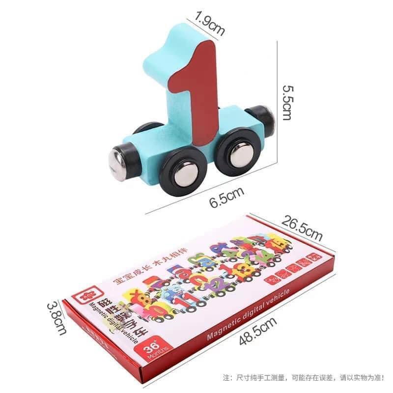 - Sơn màu đẹp mắt, mịn, ko có hiện tượng bong tróc sơn. Đoàn tàu chữ: Gồm có 27 toa tàu trong đó có 1 toa đầu tàu, và 26 toa là chữ cái. Đoàn tàu số và phép tính: gồm 27 toa, 1 toa đầu tàu, các toa số 0-20 kèm các toa phép tính +-x/= ĐẶC BIỆT, giữa các toa được nối với nhau bằng lực hút nam châm cực kì chắc chắn . Khi chơi sẽ giúp con: