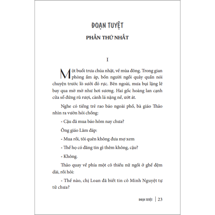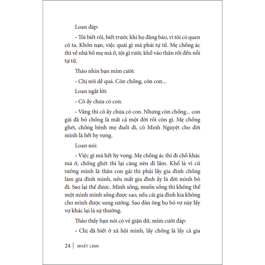 Trên Phong Hóa, số 124, ngày 16/11/1934, Đoạn Tuyệt của Nhất Linh xuất hiện, chấm dứt kiểu khuyên răn đạo đức nhẹ nhàng và trình diện một tinh thần vô cùng mới: mỗi phụ nữ, hãy chấm dứt những bổn phận tòng thuộc chồng, để tự định đoạt lấy cách sống và giá trị của mình.