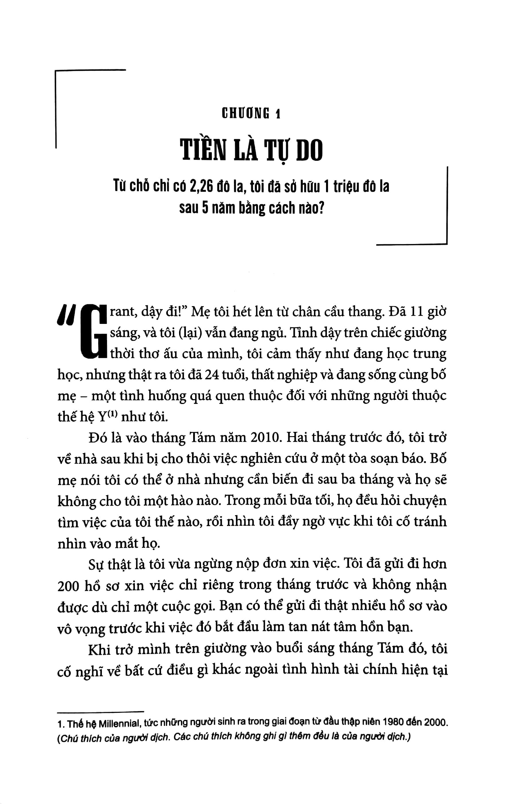 Năm 2010, chàng trai Grant Sabatier 24 tuổi tỉnh dậy với 2,26 đô la trong tài khoản ngân hàng. Năm năm sau, anh đã có giá trị ròng là hơn 1,25 triệu đô la. Ở tuổi 30, anh đã đạt được tự do tài chính.