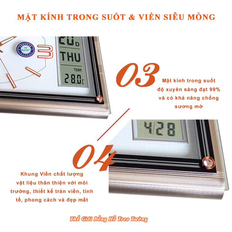 1. ĐẶC ĐIỂM NỔI BẬT: - Đồng Hồ Treo Tường Cao Cấp EASTAR Kim điện tử, Dạ quang, Đồng hồ Lịch Vạn Niên và Nhiệt kế hình Chữ nhật, Mặt kính Nổi, hiện đại, sang