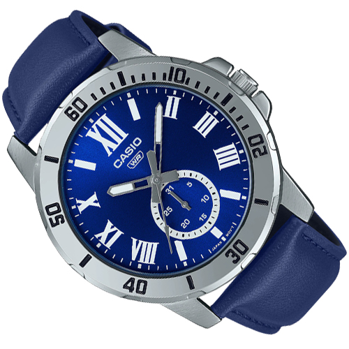 Đồng hồ Casio MTP-VD200BL-5BUDF thuộc Casio nam với dây da, nhiều kim, chống nước, mặt số la mã.