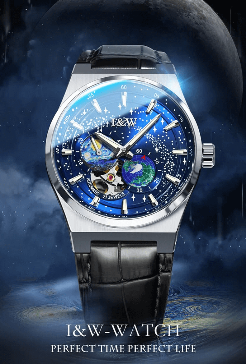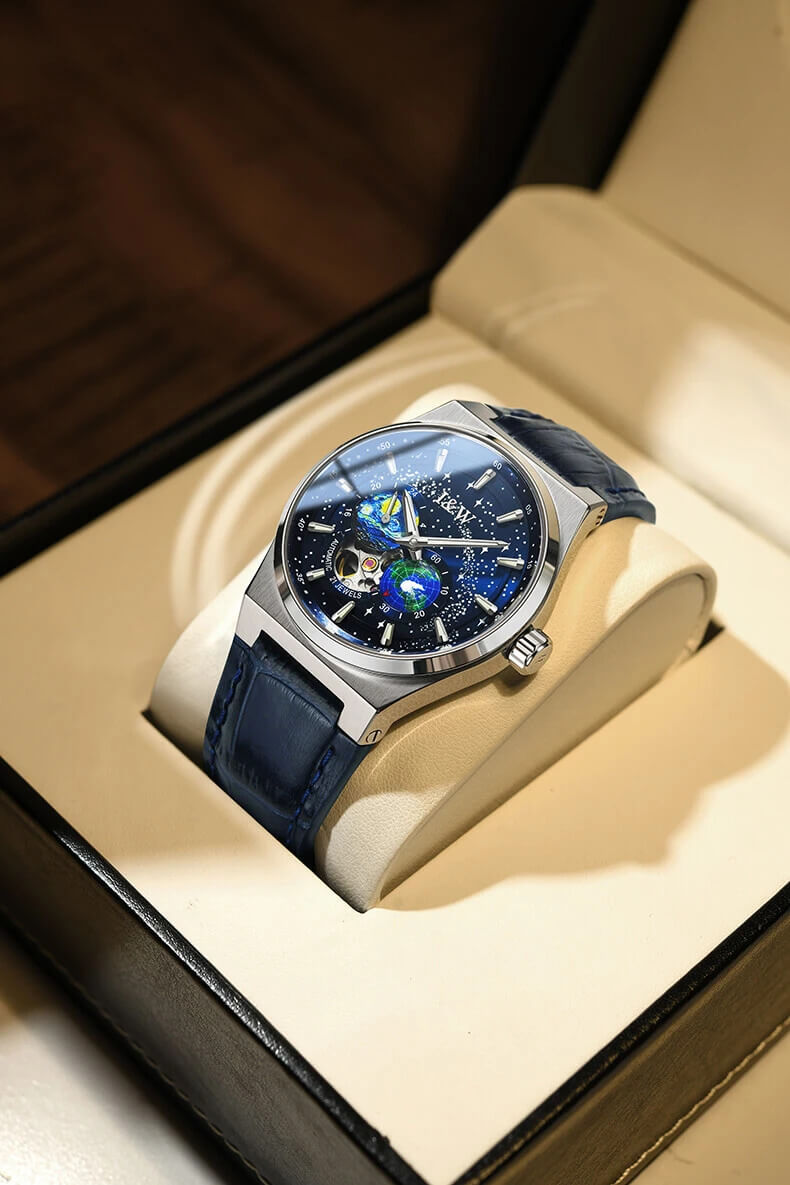 Sự kết hợp hoàn hảo đến khó tin của mặt dial vạn vì sao lấp lánh như bầu trời trong đêm cùng với sự sáng tạo kim giây mô phỏng vòng quay của Trái Đất không ngừng nghỉ (đặc sắc hơn với dạ quang siêu sáng ban đêm)