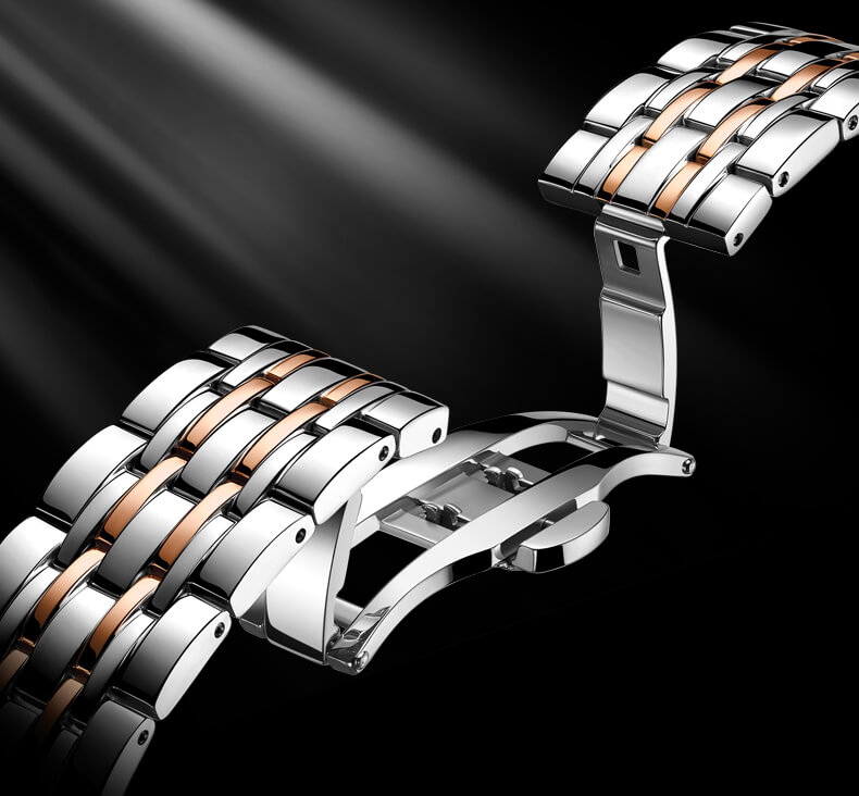 Đặc điểm kỹ thuật - - Vật liệu vỏ / gờ: Mạ ion - Chốt gập 3 chỉ với một lần bấm - Dây đeo bằng thép không gỉ - Mặt kính khoáng - Khả