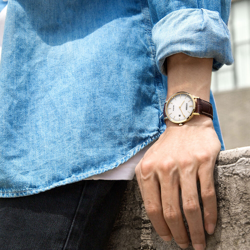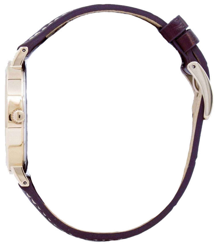 - Vật liệu vỏ / gờ: Sắc vàng kim - Dây đeo bằng da - Mặt kính khoáng - Chống nước - Giờ hiện hành thông thường Đồng hồ kim: 3 kim (giờ, phút, giây)