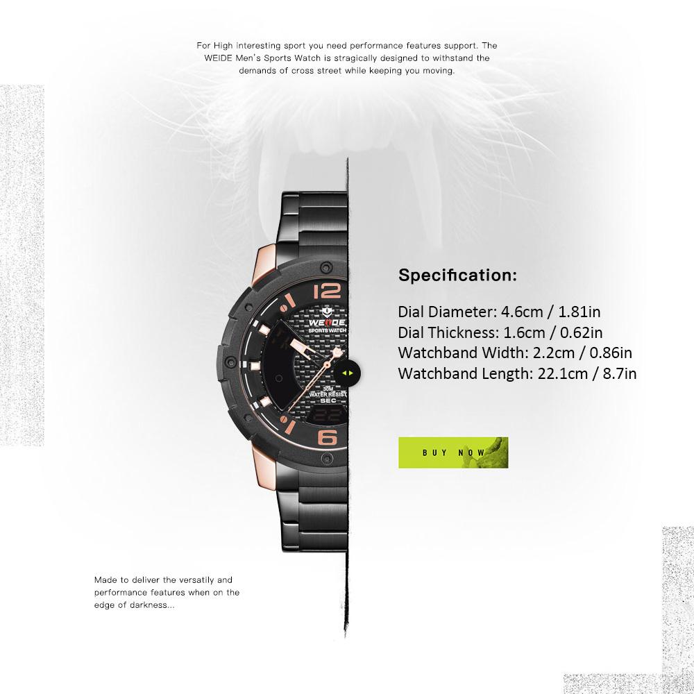 Introduction: WEIDE watch has professional craft, durable and comfortable to wear. The stylish and exquisite workmanship will keep you at the forefront of the fashion. Durable watch band, 3ATM water-resistant as well as many practical
