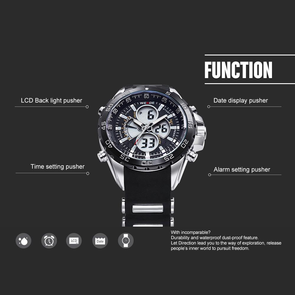WEIDE WH1103 is a stylish sport watch with the function of auto date, alarm and stopwatch that certainly catches your heart! Features: With 12/24 Hours display, quartz and digital movements keeps good time. Attractive design
