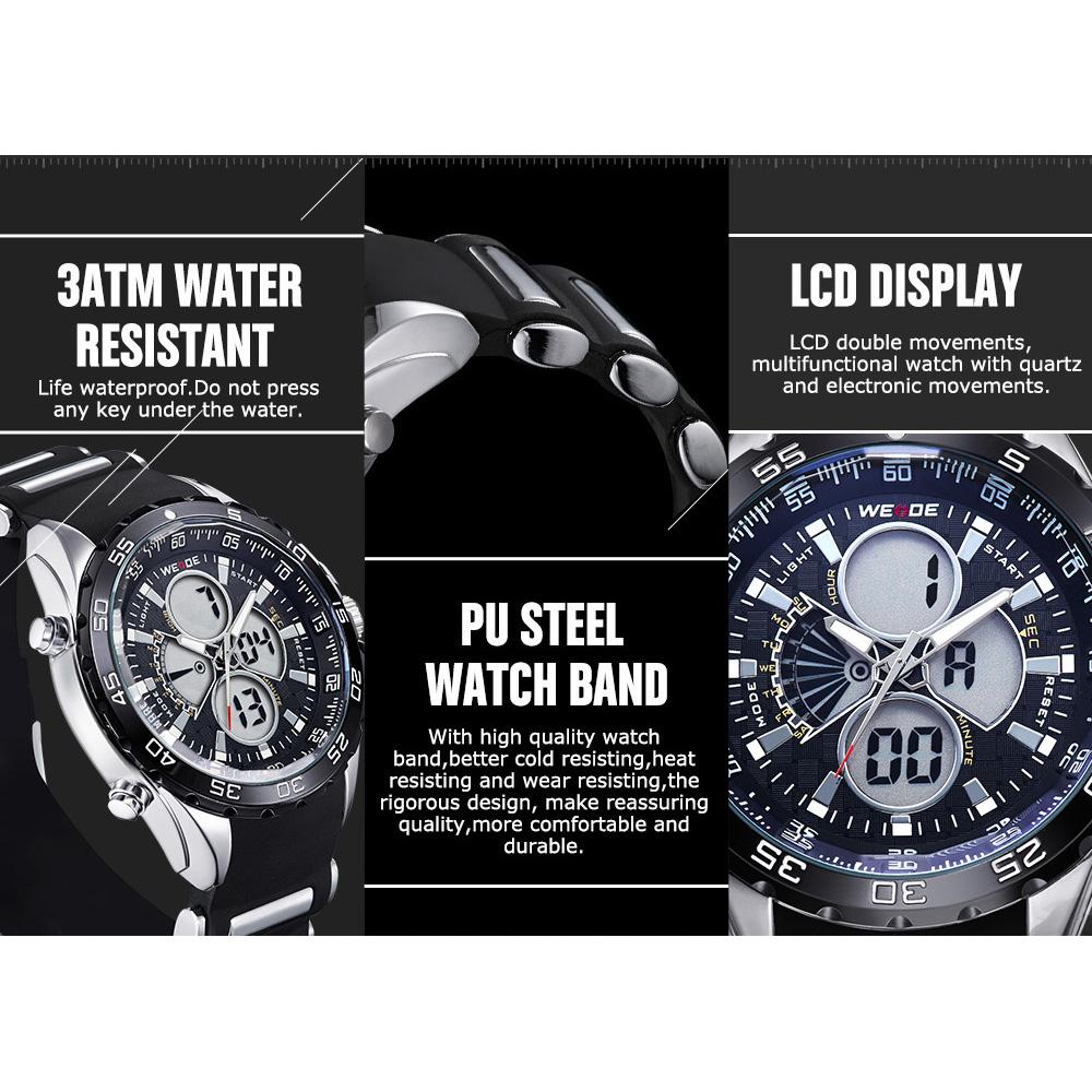 WEIDE WH6105 is a dual display quartz digital men watch for big-dial lover with tachymeter engraved on the case and the function of stopwatch and week. Features: - Six attractive versions for option. - Flashing