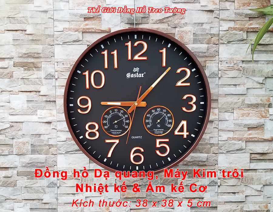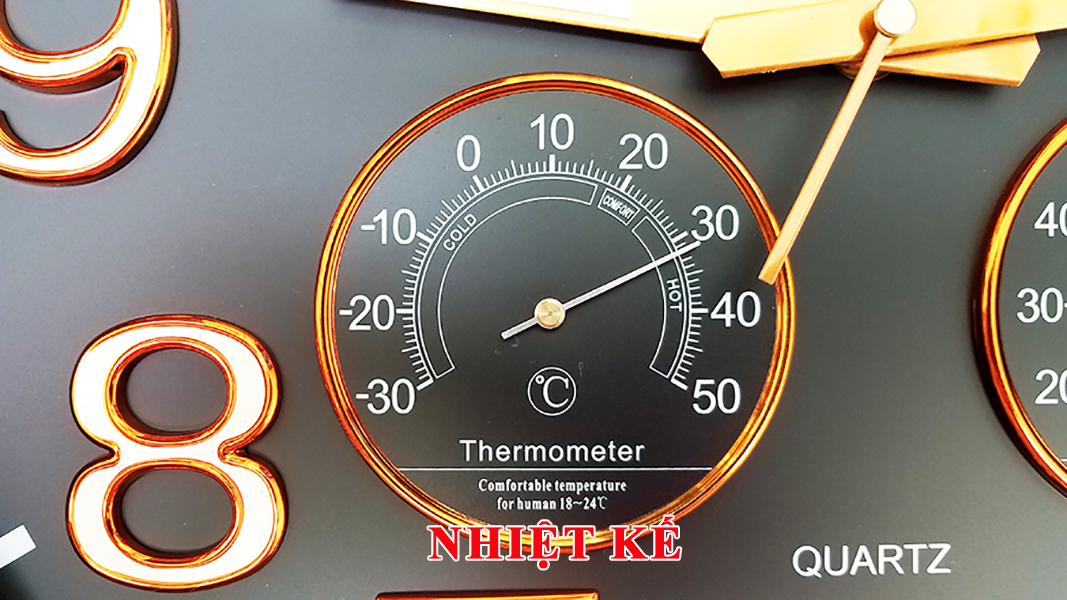 (*) Nhiệt ẩm kế tự động sử dụng nguyên lý co dãn của lò so kim loại dựa trên điều kiện thời tiết để hiển thị nhiệt độ và độ ẩm xung quanh nơi treo đồng hồ. Không nên sử dụng cho mục đích khác. Đây cũng không phải là dụng cụ nhiệt ẩm kế chuyên dụng. Mức sai số của Nhiệt kế là ± 2oC. Mức sai số của Ẩm kế là ± 10%.