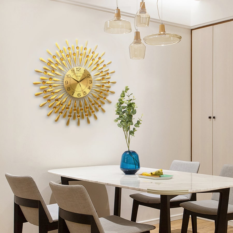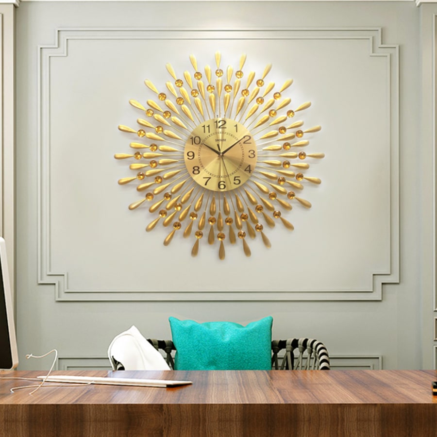 Đồng Hồ Treo Tường Trang Trí Đẹp S-A30 độc lạ 3d cỡ lớn nghệ thuật phù hợp cho phòng khách, phòng ngủ Hình ảnh thực tế của đồng hồ nước mắt mặt trời A30 Kích thước thực tế của đồng hồ nước mắt mặt trời A30 Dễ dàng bài trí với nhều không gian phòng khách khác nhau   Đồng hồ nước mắt mặt trời A30 trang trí tại phòng bếp Đồng hồ nước mắt mặt trời trang trí tại phòng khách Tạo điểm nhấn cho không gian nhà của bạn Kiểu dáng sang trọng, tinh tế và hiện đại Đồng hồ nước mắt mặt trời trang trí trong phòng làm việc Đồng hồ treo tường SHOUSE - Sự lựa chọn số một cho không gian nhà của bạn! Các mẫu đồng treo tường được thiết kế sáng tạo đang là xu hướng nội thất tạo điểm nhấn cho phòng khách, được nhiều gia đình yêu thích. Mỗi gia chủ đều mong muốn kiến thiết không gian sống, nhất là phòng khách, trở nên mới lạ và thu hút hơn, nhằm thể hiện dấu ấn cá nhân và nâng cao hiệu quả thẩm mỹ cho mái ấm. Nếu bạn đang có ý định trang hoàng phòng khách trong dịp năm mới, đồng hồ trang trí là lựa chọn tốt để tạo điểm nhấn sang trọng. Xu hướng trang trí sang trọng Xu hướng trang trí đồng hồ nghệ thuật là một trong những lựa chọn được không ít gia chủ yêu thích. Một chiếc đồng hồ treo tường đẹp không chỉ giúp theo dõi thời gian, mà còn trở thành đồ trang trí nội thất nổi bật. Với kiểu dáng thiết kế độc đáo và mới lạ, mỗi sản phẩm đều mang tới điểm nhấn khác lạ trong trang trí kiến trúc nội thất. Gợi ý một số mẫu đồng hồ trang trí nội thất đẹp Nếu yêu thích phong cách trẻ trung và cá tính, bạn không nên bỏ qua mẫu thiết kế đồng hồ trang trí hiện đại. Với thiết kế mới lạ và mạnh mẽ, mẫu thiết kế này mang tới cho căn hộ sự phóng khoáng và sang trọng. Sản phẩm được thiết kế tinh xảo. Với tone màu vàng và bạc lấp lánh, chất liệu thép chống gỉ, đây sẽ là món đồ mang lại nét sang trọng cho không gian sống.