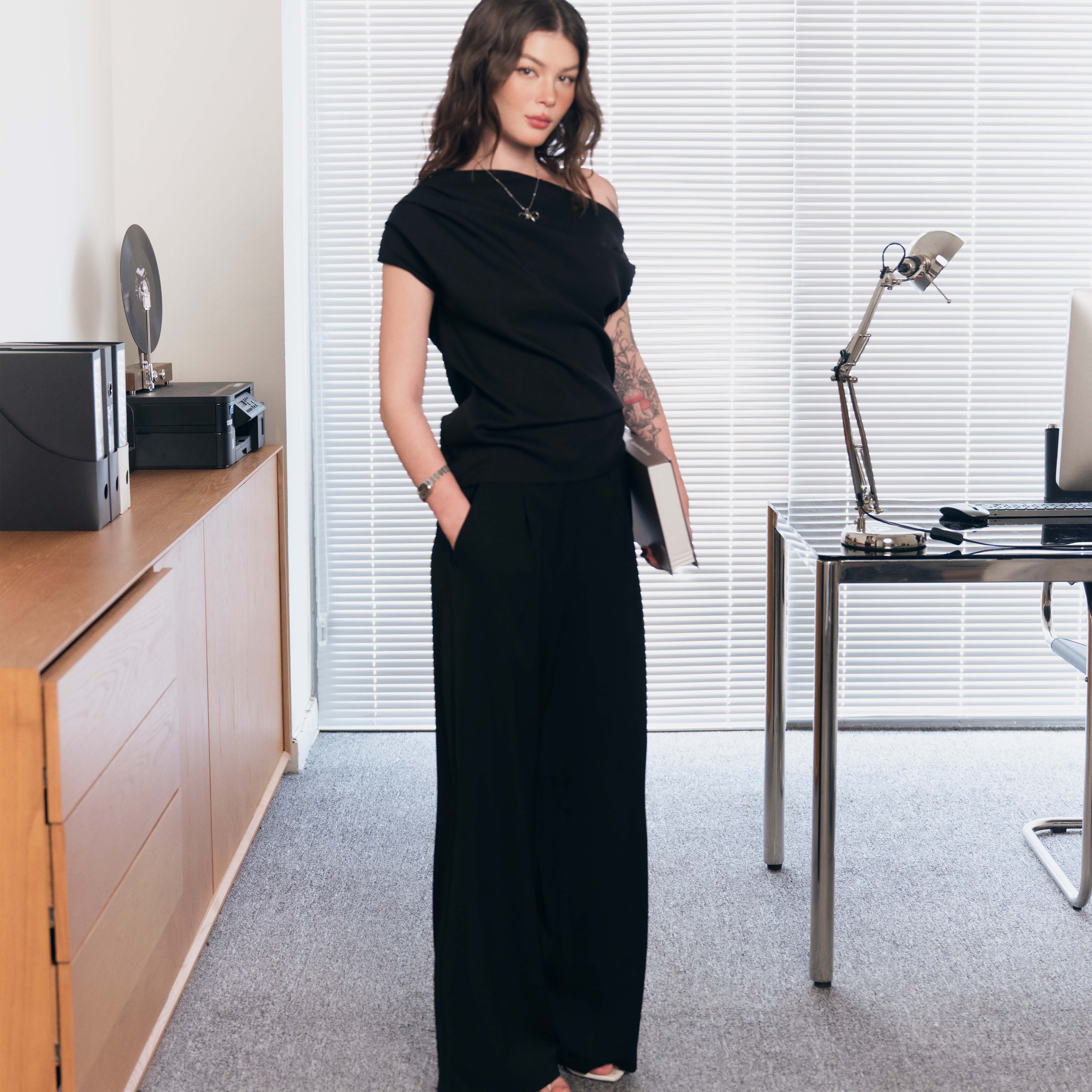 - Chất liệu: Cotton - Thiết kế: Quần tây ống rộng với lưng cao, đường may tỉ mỉ, ít nhăn. Thiết kế thanh lịch, tôn dáng và tạo cảm giác thoải mái khi mặc.